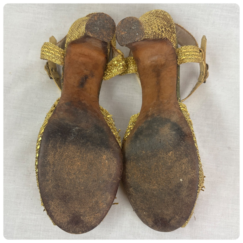 1930s Art Deco Strappy Metallic Gold Lame Woven Peep Toe Heels US Size 7