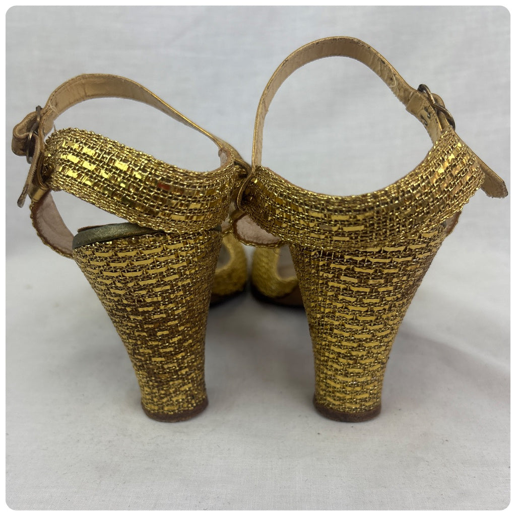 🌟 1930s Art Deco Strappy Metallic Gold Lame Woven Peep Toe Heels US Size 7