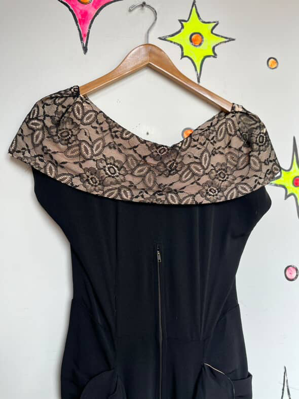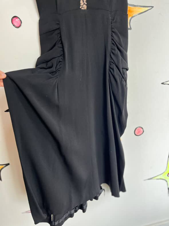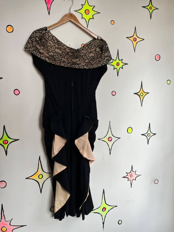 Turn heads with this classic 1950s mermaid-style wiggle dress in timeless black 🖤. Featuring dramatic cascade ruffles down the back, this piece embodies Old Hollywood sophistication and allure. Perfect for collectors, vintage enthusiasts, or anyone looking for a statement cocktail dress.