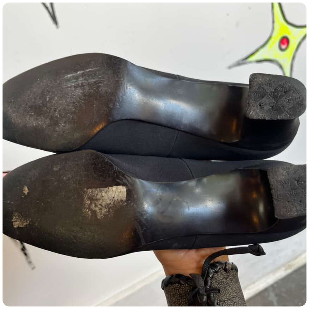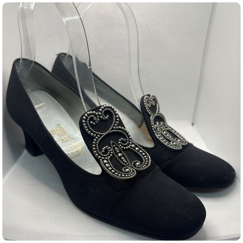 ✨ 1960s Black Satin Low Heel Loafers - Stud Embellishment- Narrow Fit - Size 6.5/7 ✨