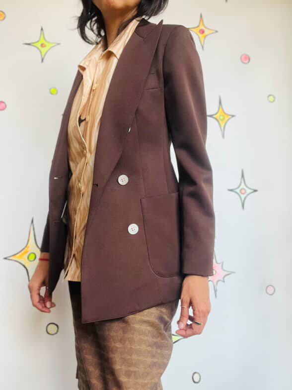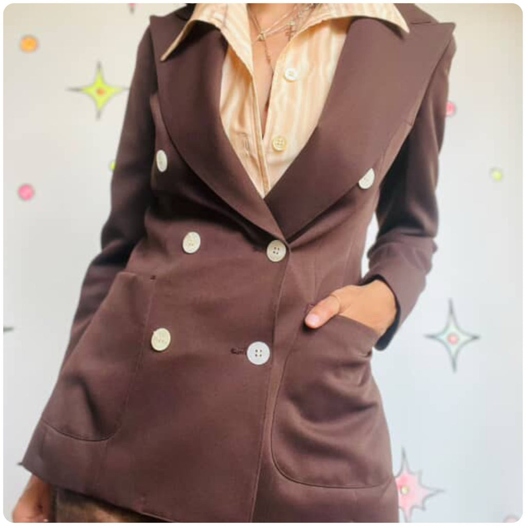 Description: Groovy 1970s chocolate brown blazer by Evan Picone for Neiman Marcus. Features a dramatic oversized collar and classic retro tailoring. A true vintage gem in very good condition - no stains or tears. Material tag is missing, but feels like a soft poly blend. Best suited for size XS.