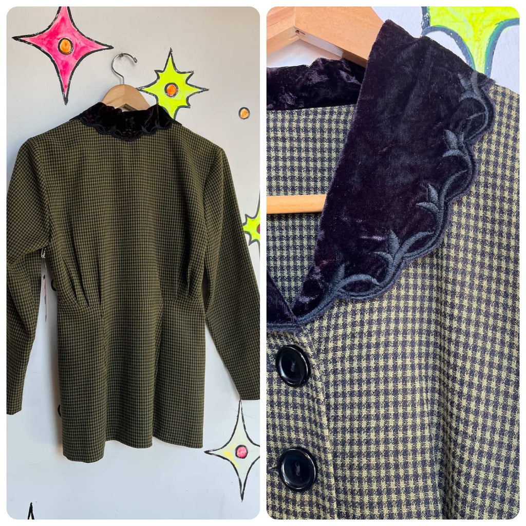 š 90s Does 40s Olive & Black Houndstooth Blazer ' Velvet Scallop Collar ' Goth Grunge Revival ' Small