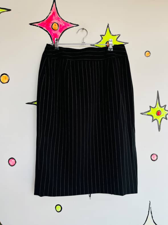 Serve serious Y2K office siren meets dark academia energy in this vintage 90s pencil skirt from Nine & Company. Black with bold red pinstripes, this piece blends preppy sophistication with an edgy, gothic twist. Perfect for powering through your 9-to-5 or your next poetry reading at midnight.