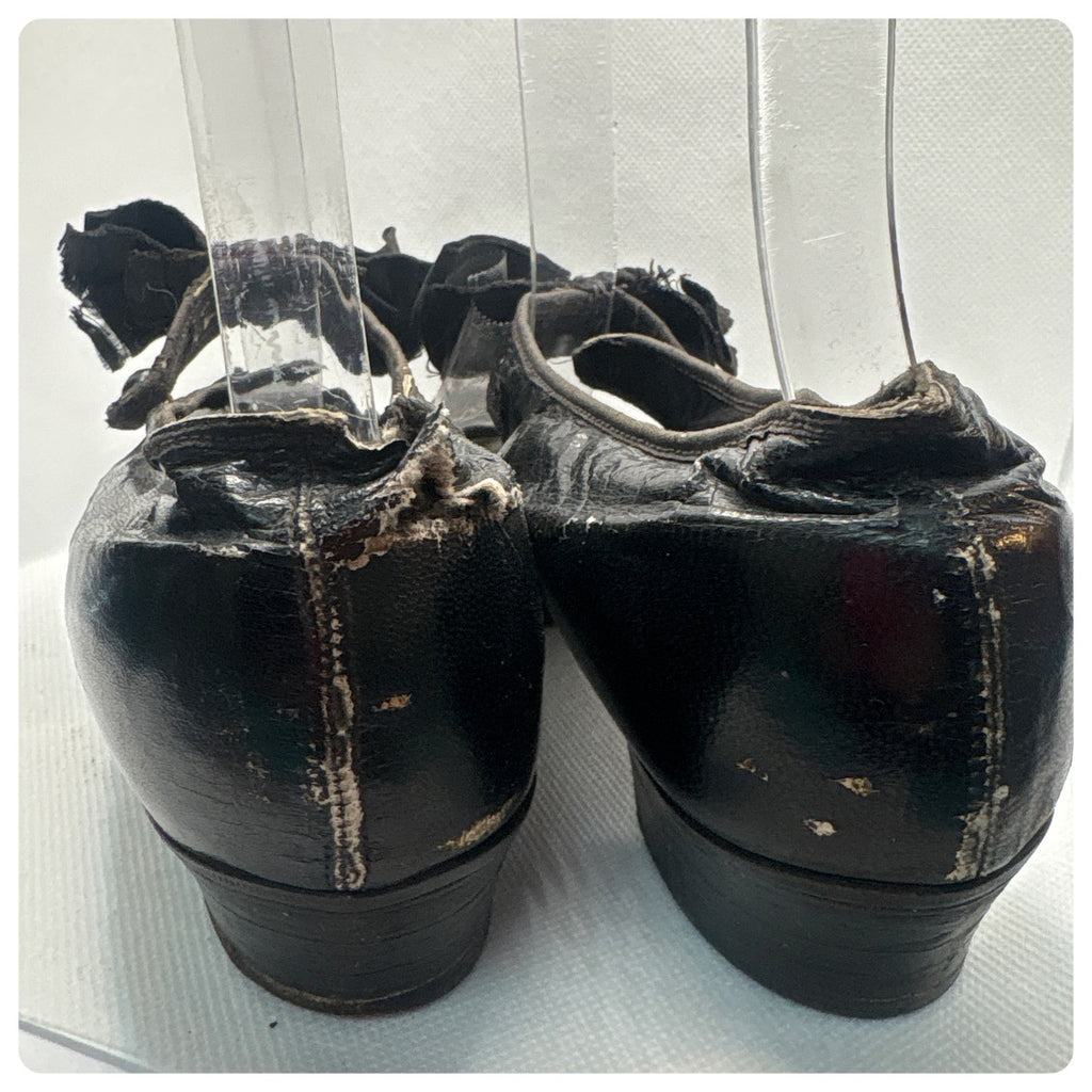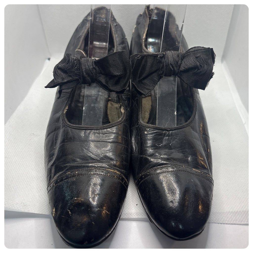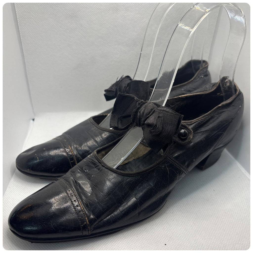 Antique 1910s 20s Black Leather Mary Jane Pumps w Silk Bows - Edwardian – Size 5