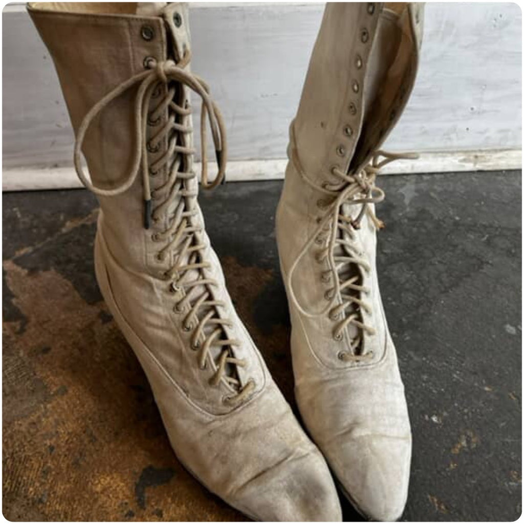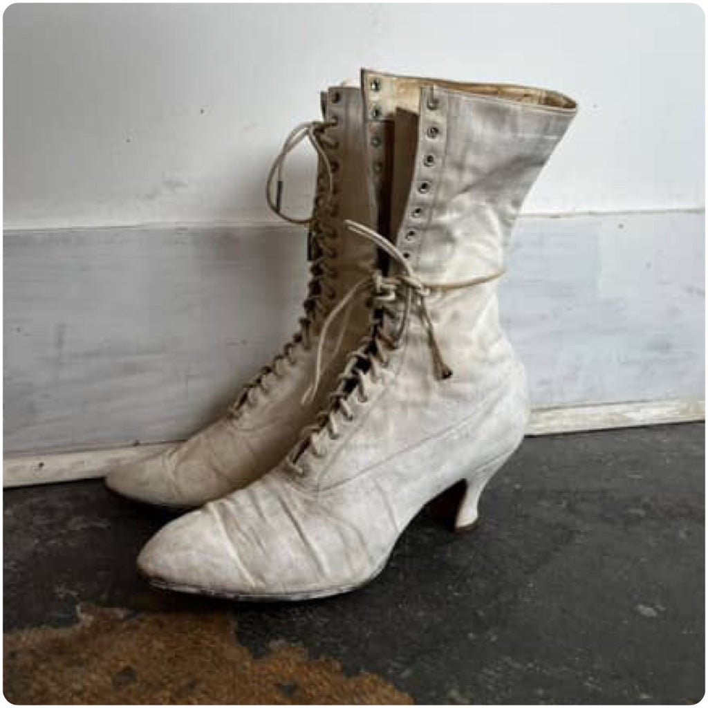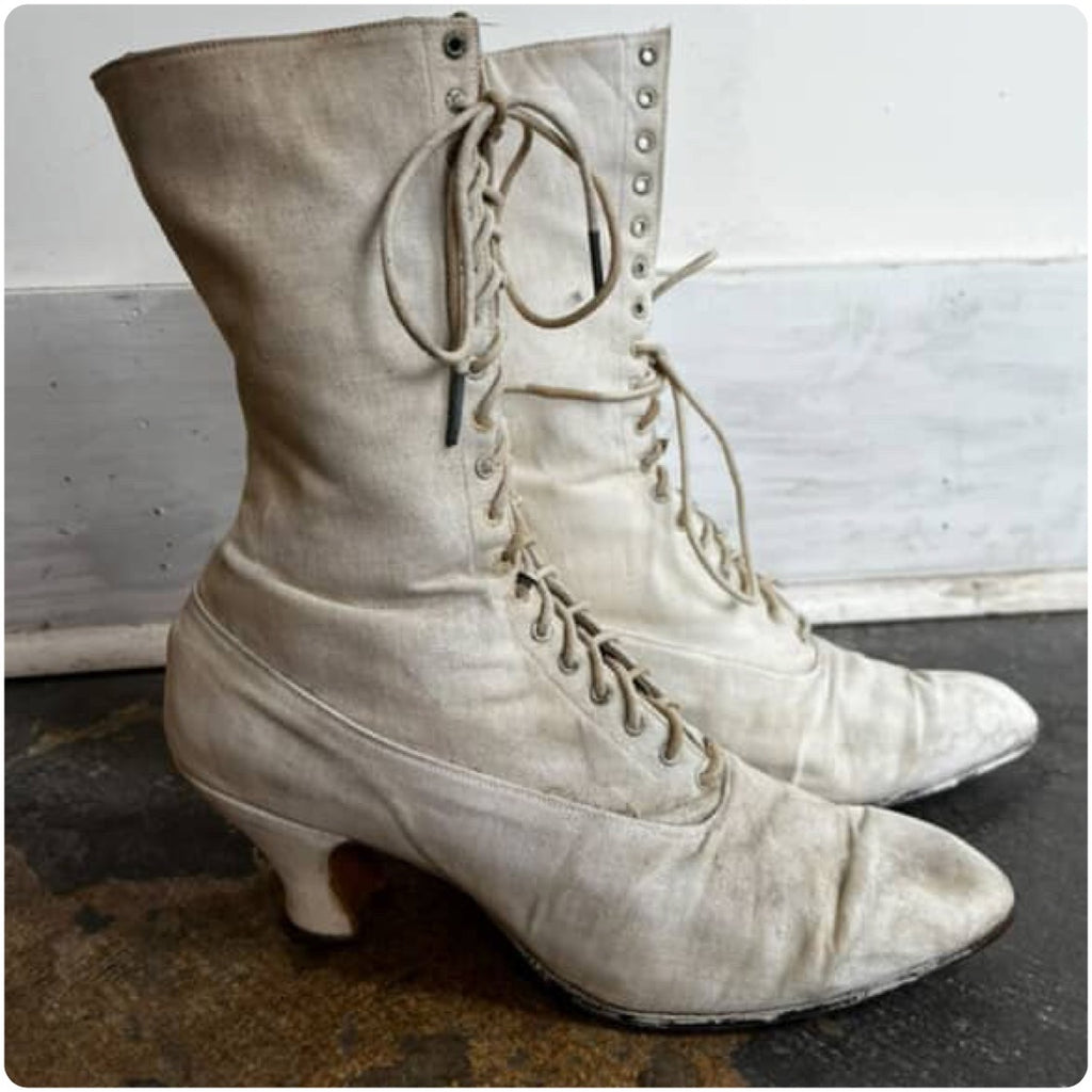 Antique Canvas Victorian Boots | White Pointy Lace Up Wedding Boots | 8 - 8.5