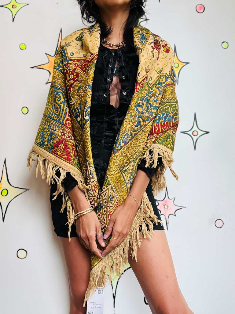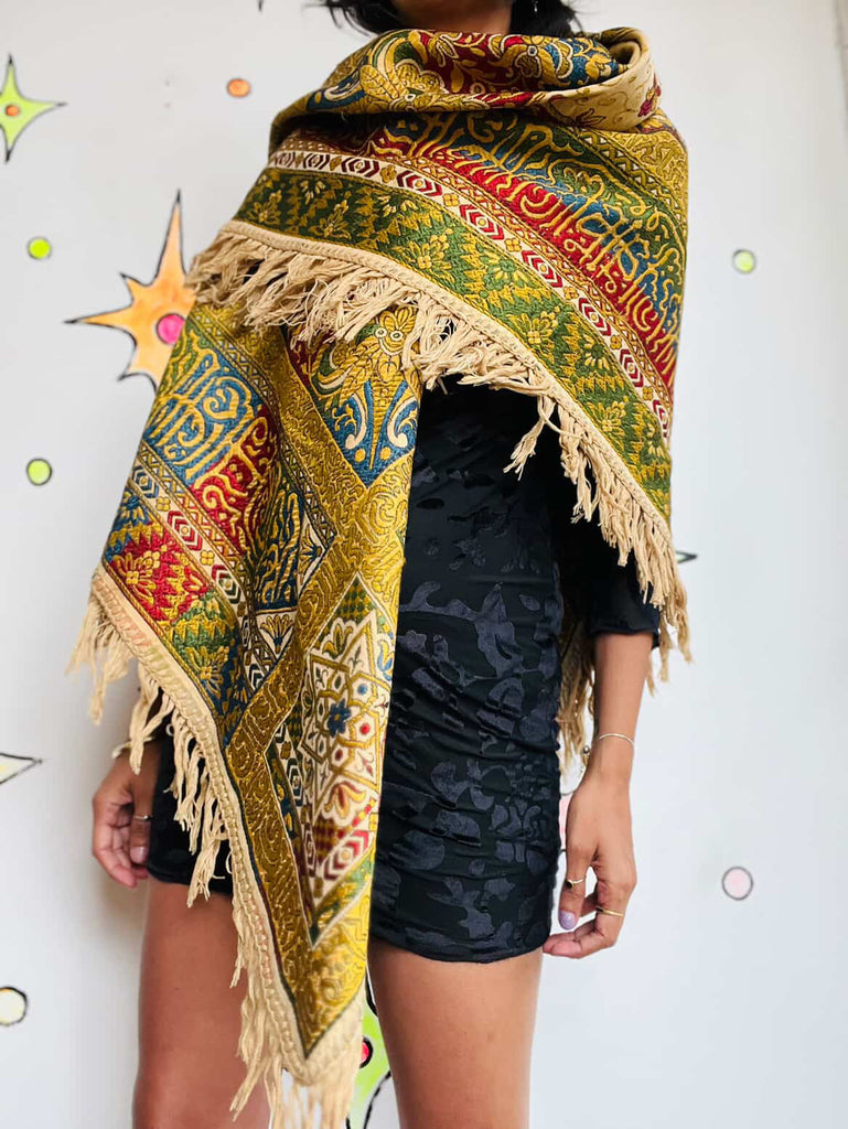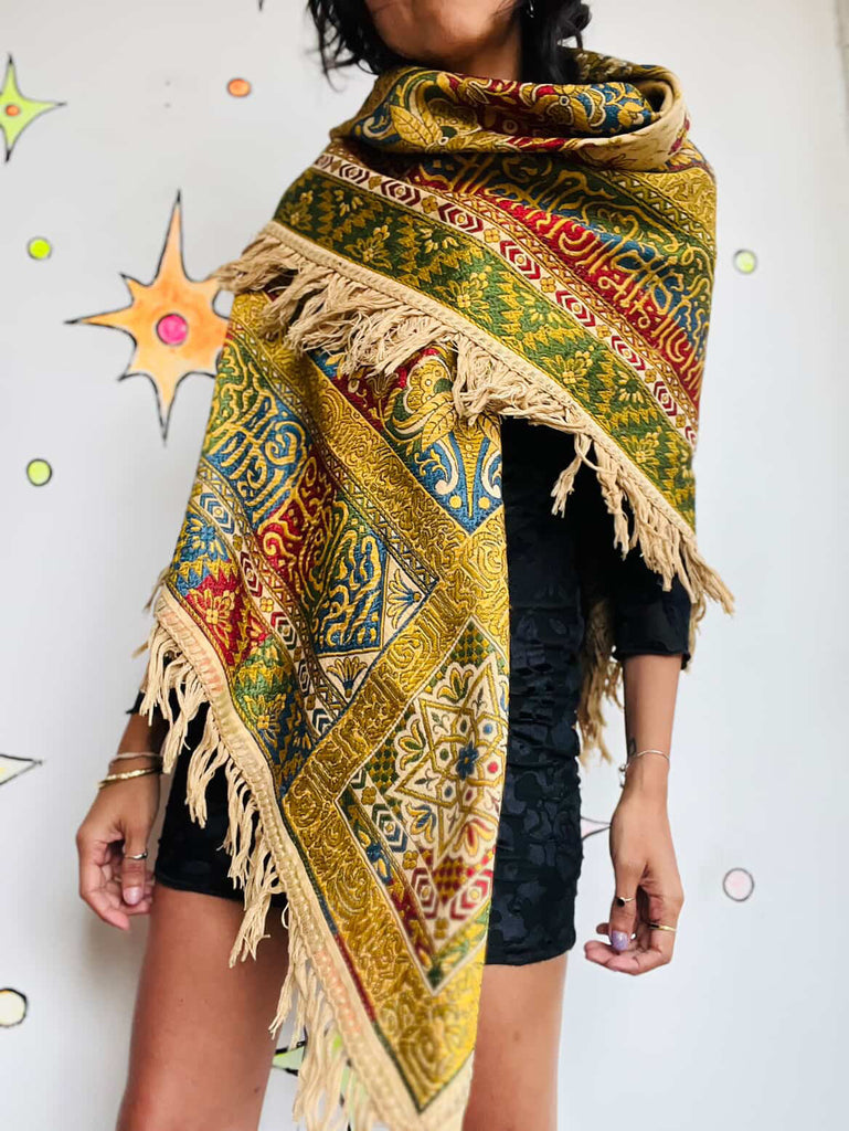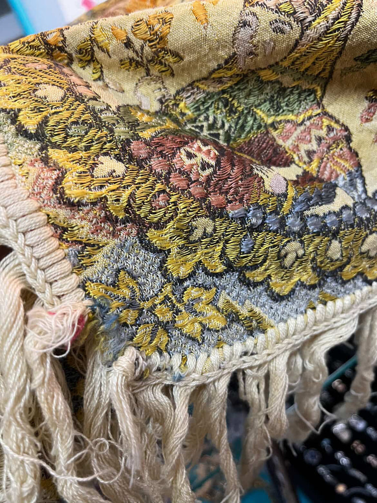 🕌 Antique Islamic Silk Tapestry or Shawl - Ornate Woven Textile with Fringe