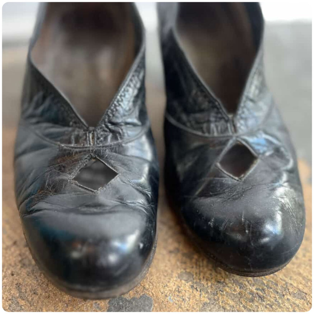 Step into a darker kind of elegance with these antique black patent leather shoes from the early 1900s. With their pointed toe, curved 2.5" heel, and delicate silhouette, they exude Victorian charm and witchy refinement. Perfect for collectors, costumers, or those channeling romantic goth or dark cottagecore vibes.