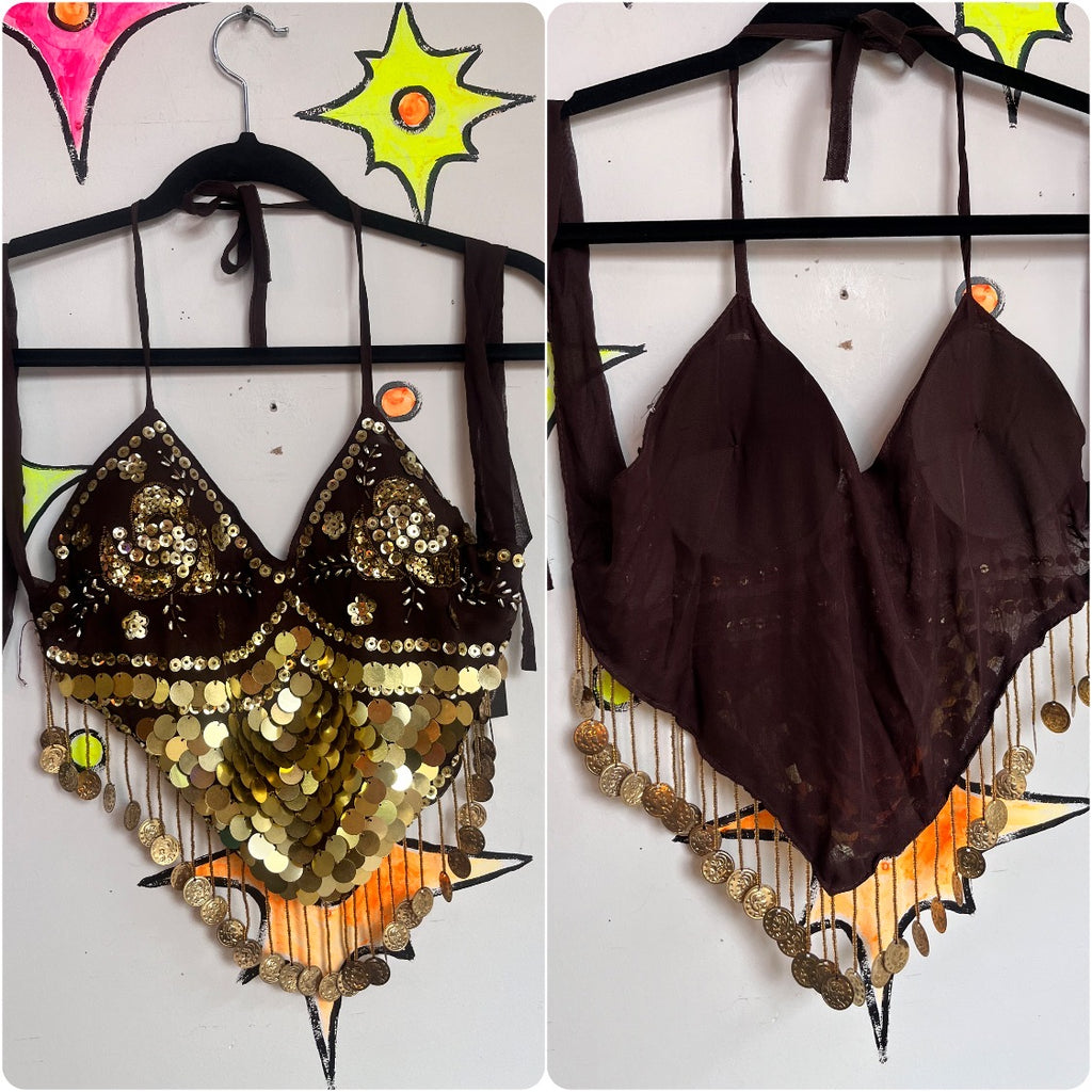 Boho Gypsy Fairy Grunge Beaded Gold Coins Halter Top Show Girl Dance One Size
