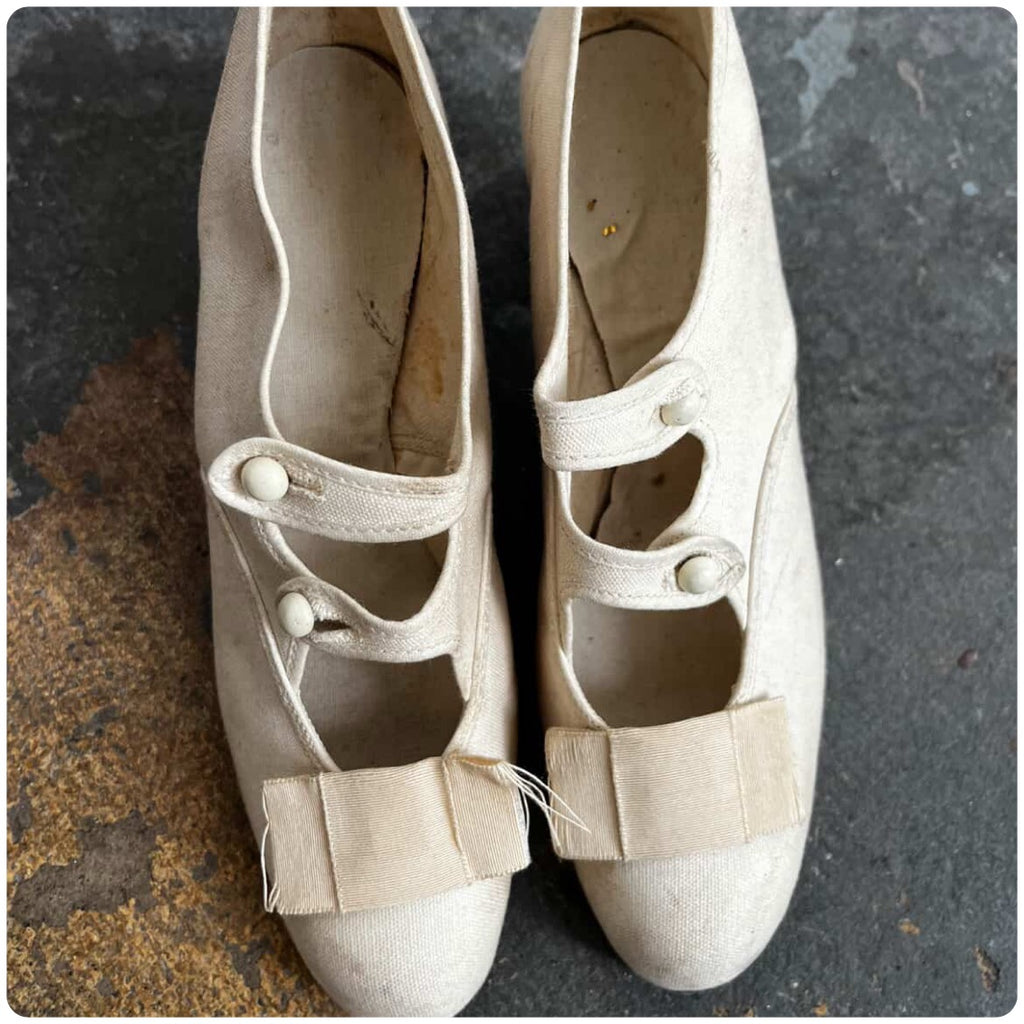 Timeless and sweet, these vintage double-button strap Mary Janes feature a classic Edwardian look in soft white and beige canvas. The low heel and round toe give them a romantic, antique feel-perfect for vintage styling, bridal, or historical costuming.