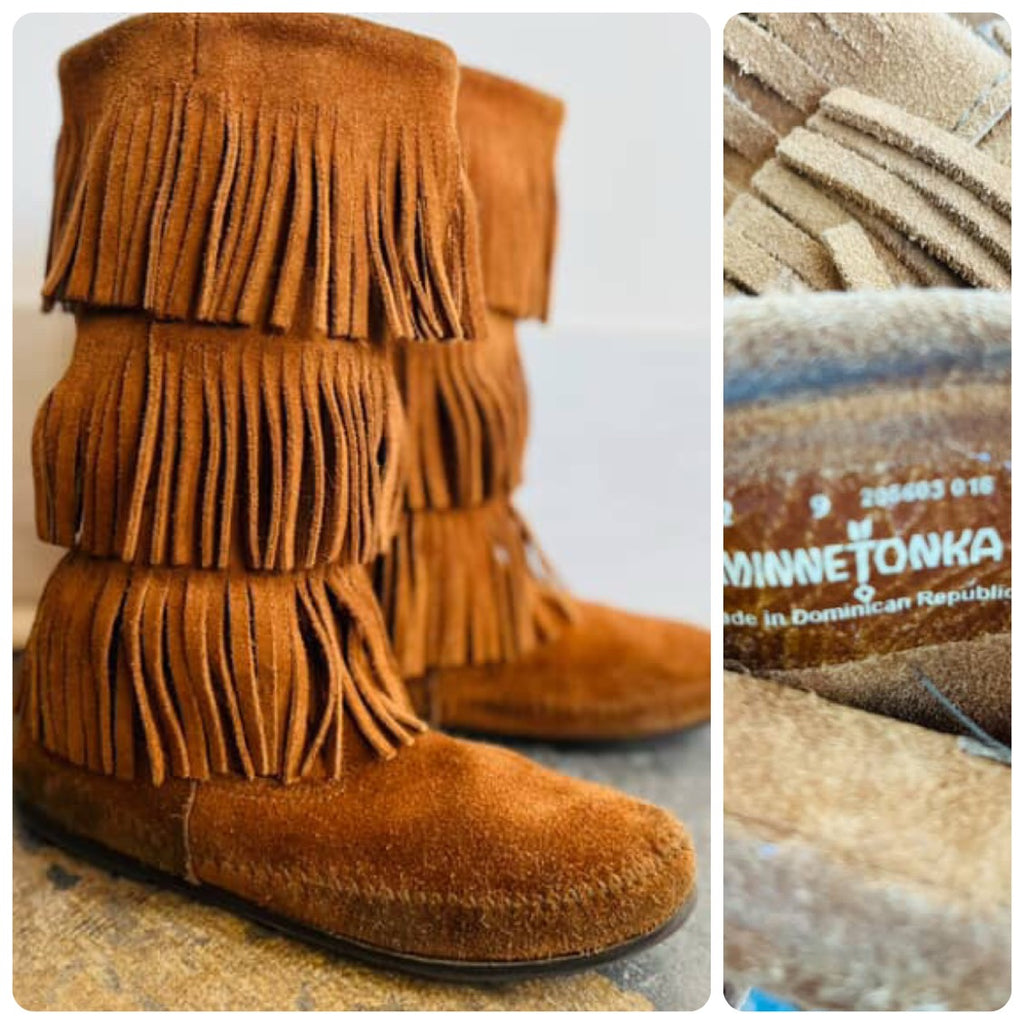 Minnetonka Tan Brown Suede Fringe Moccasin Boots Womens | Size 9