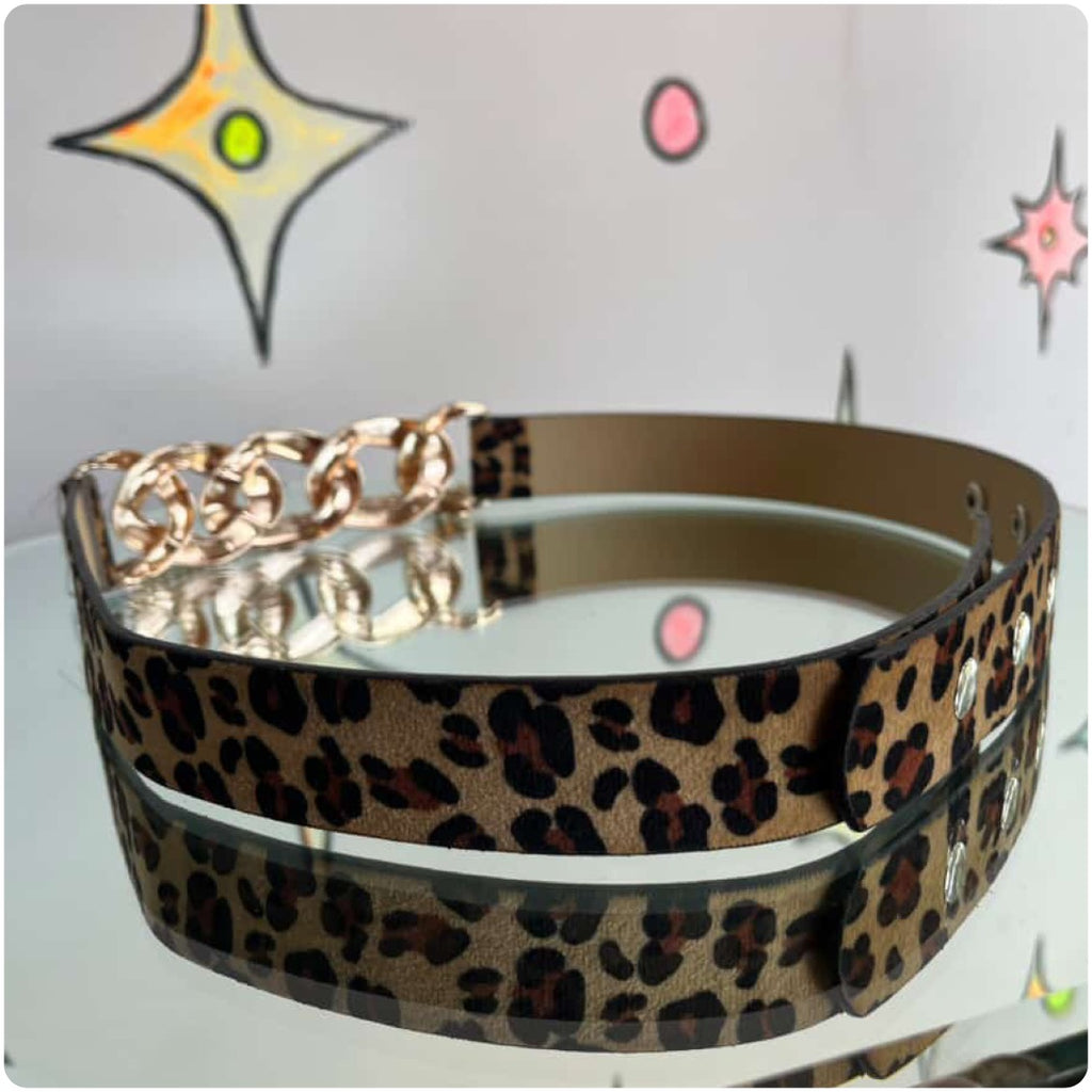 Unleash your inner rockstar with this fierce vegan leopard print belt, decked out in gold chain embellishments for extra glam. With multiple adjustable belt clips and a flexible fit, this statement piece brings major Y2K, boho punk, and glam grunge vibes. Whether layered over a mini dress or slung low with jeans, this belt screams attitude.