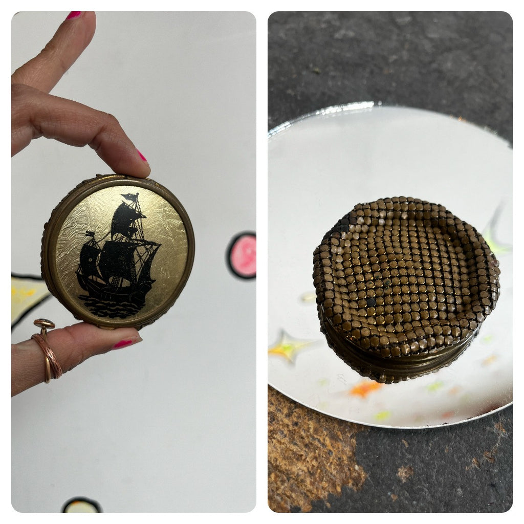 Vintage 1920s Art Deco Ship Design Mesh Powder Compact