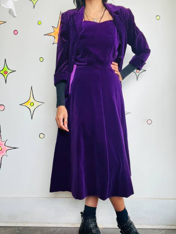 Striking vintage late-1940s to early-1950s 3-piece suit in vivid purple cotton velveteen. This rare set includes a structured jacket, a fit-and-flare dress, and a matching belt-capturing the cusp of the 40s wartime tailoring and Dior's New Look silhouette.
