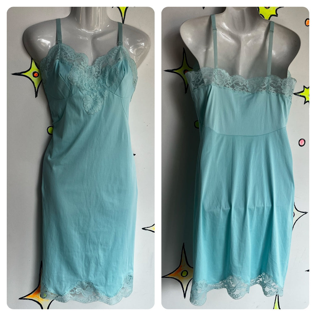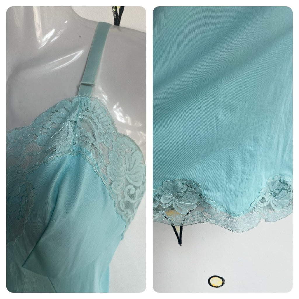 Vintage 1950s 60s ' Pale Pastel Blue Lace Fairy Babydoll Lingerie Slip ' 36