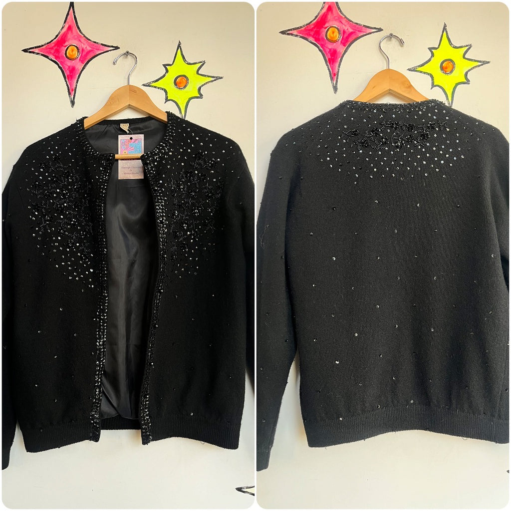 Vintage 1950s ' Beaded Black Boho Grunge Whimsy Goth Wool Cardigan Sweater ' M L