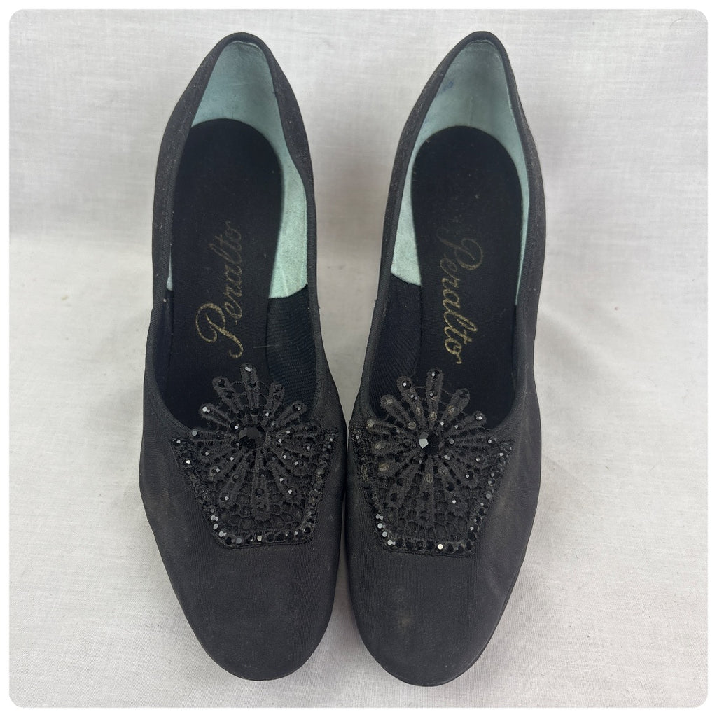 Vintage 1950s Black Glam Witchy Satin Rhinestone & Lace Embellished Heels - 8.5-9
