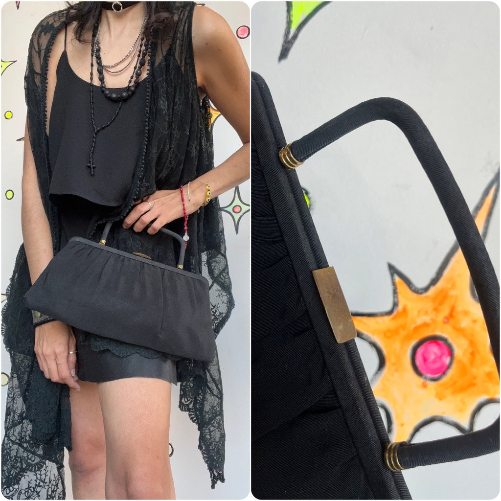 1Vintage 1950s Black Satin Goth Glam Old Hollywood Purse Bag Handbag with Handle