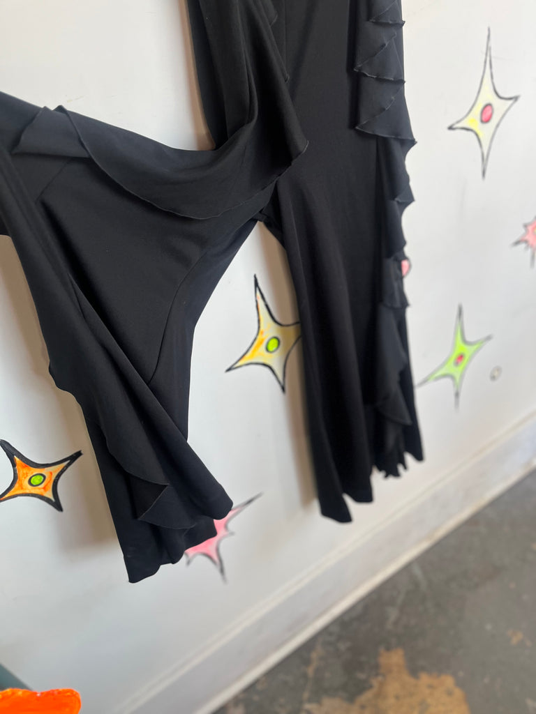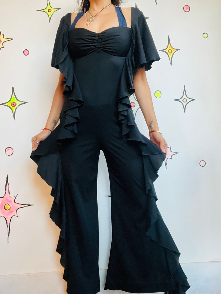 🖤 Vintage 1970s Black Ruffled Disco Jumpsuit ' Glam Flare Party Catsuit ' Small