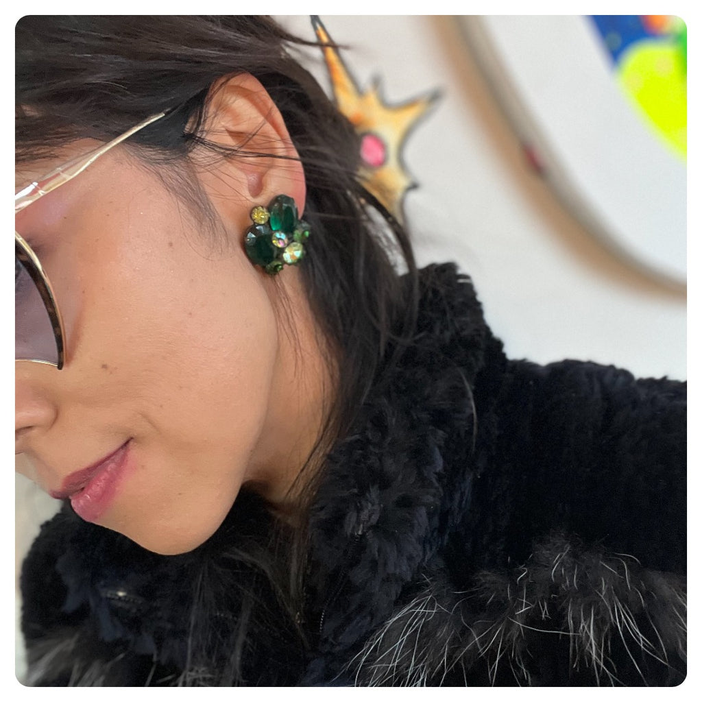 Vintage 50s 60s Green Fairy Clip On Earrings Chunky Sparkly Crystals Rhinestones