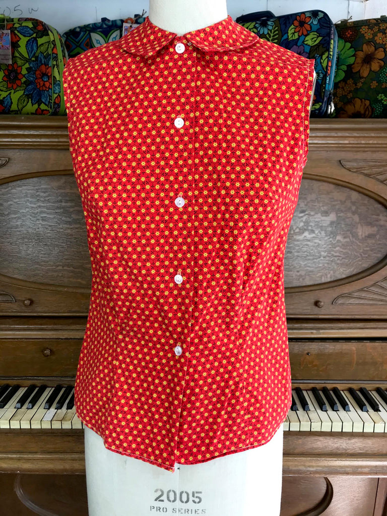 Vintage 50s | Red Pintuck Cotton Button Down Collared Sleeveless Blouse Top | S