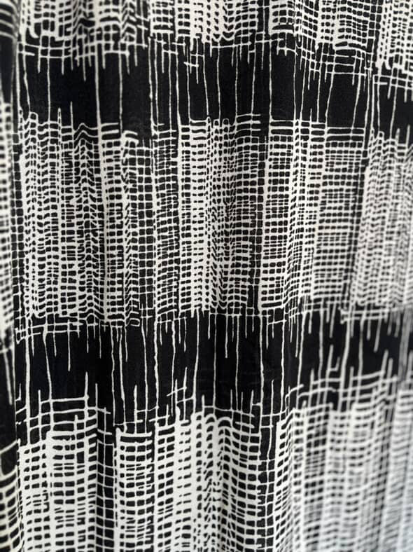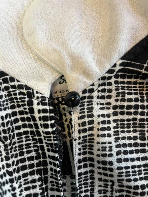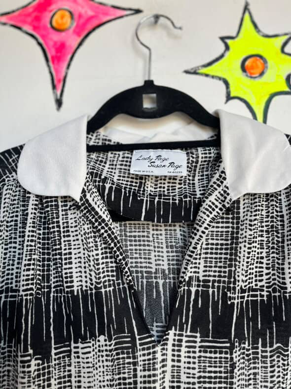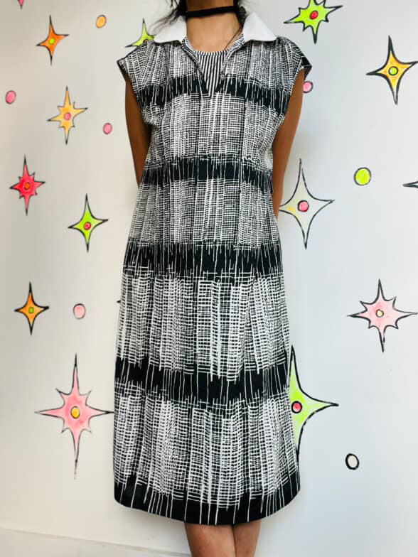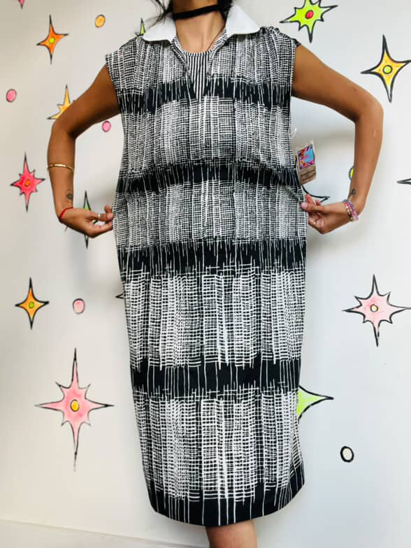 Chic vintage 1960s-1970s art print dress featuring a striking black and white pattern with a cute white collar. Lightweight and slightly stretchy fabric makes it comfortable for lounging or casual wear. A timeless piece that pairs retro charm with modern versatility. Perfect for layering or wearing as a statement dress.