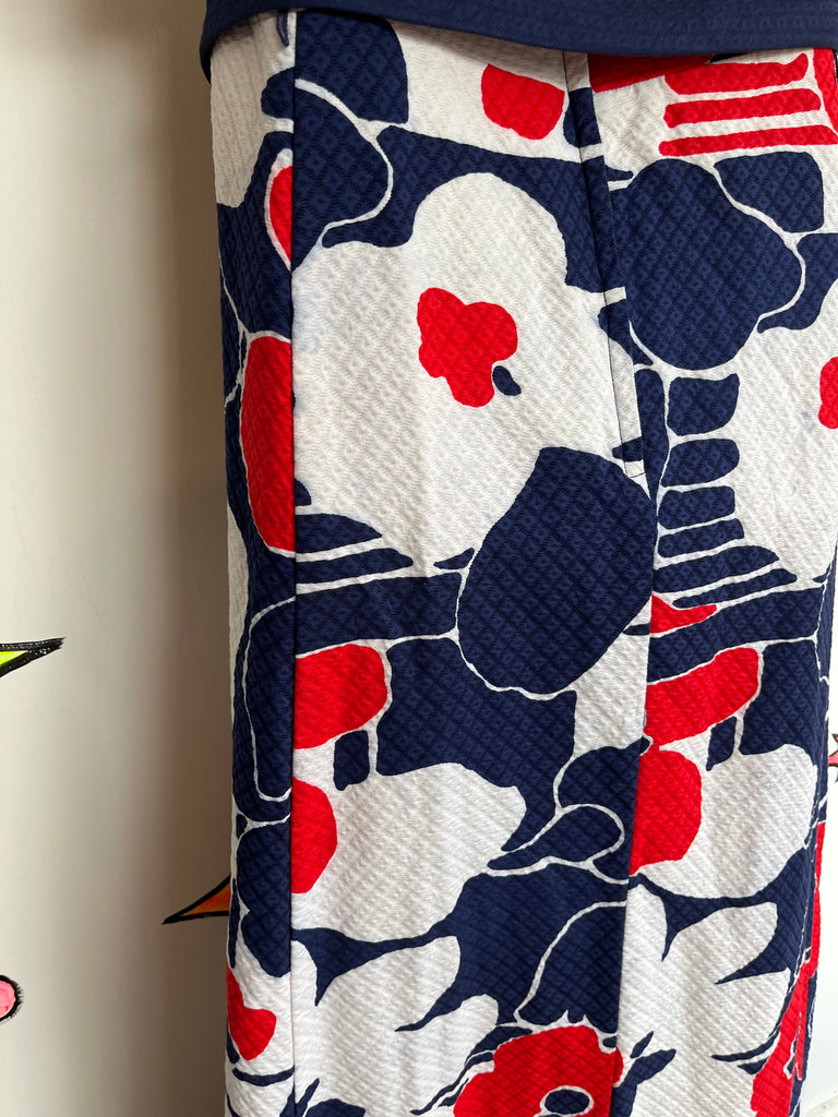 There are several places where the blue has bled onto the white fabric. See photos. Priced as is.