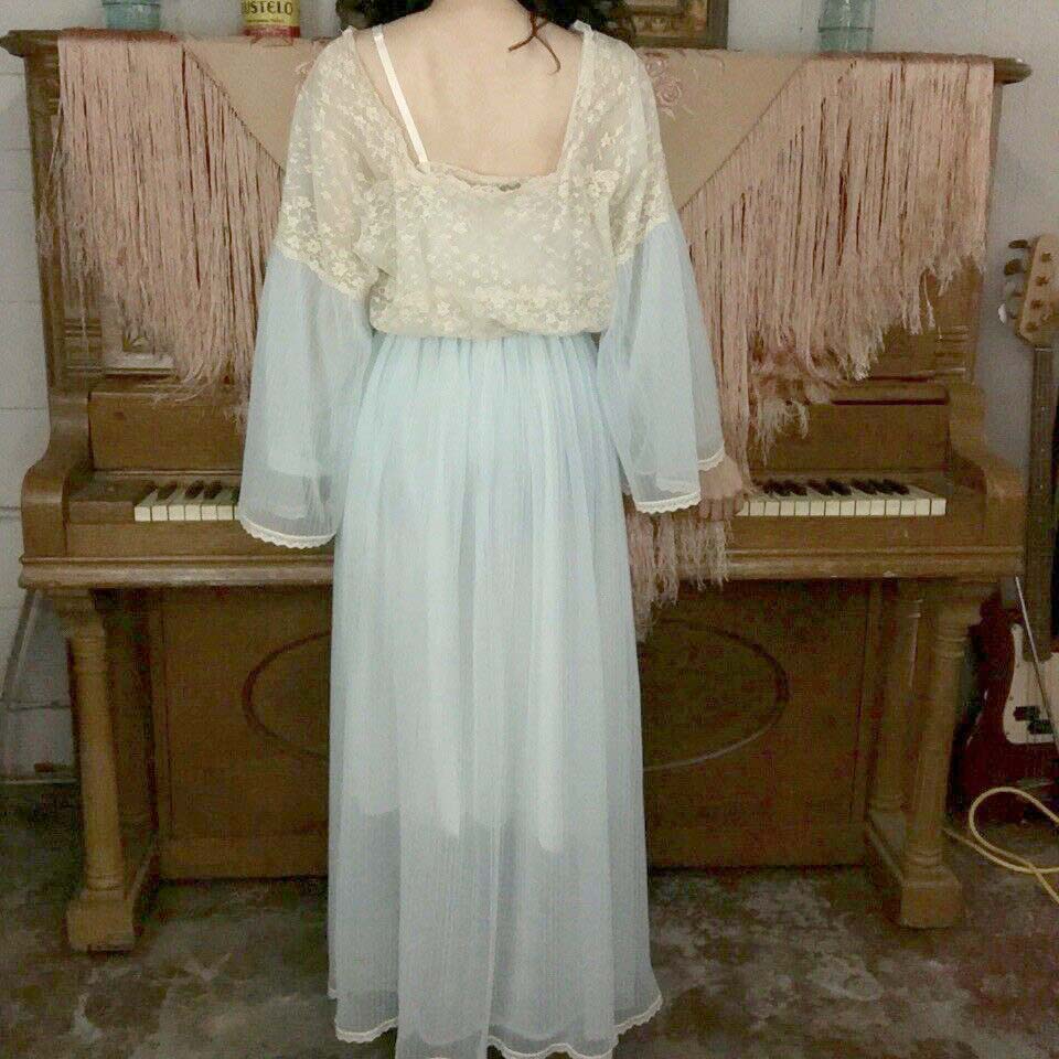 Vintage 60s Blue Double Layer Chiffon and Lace Robe | M/L