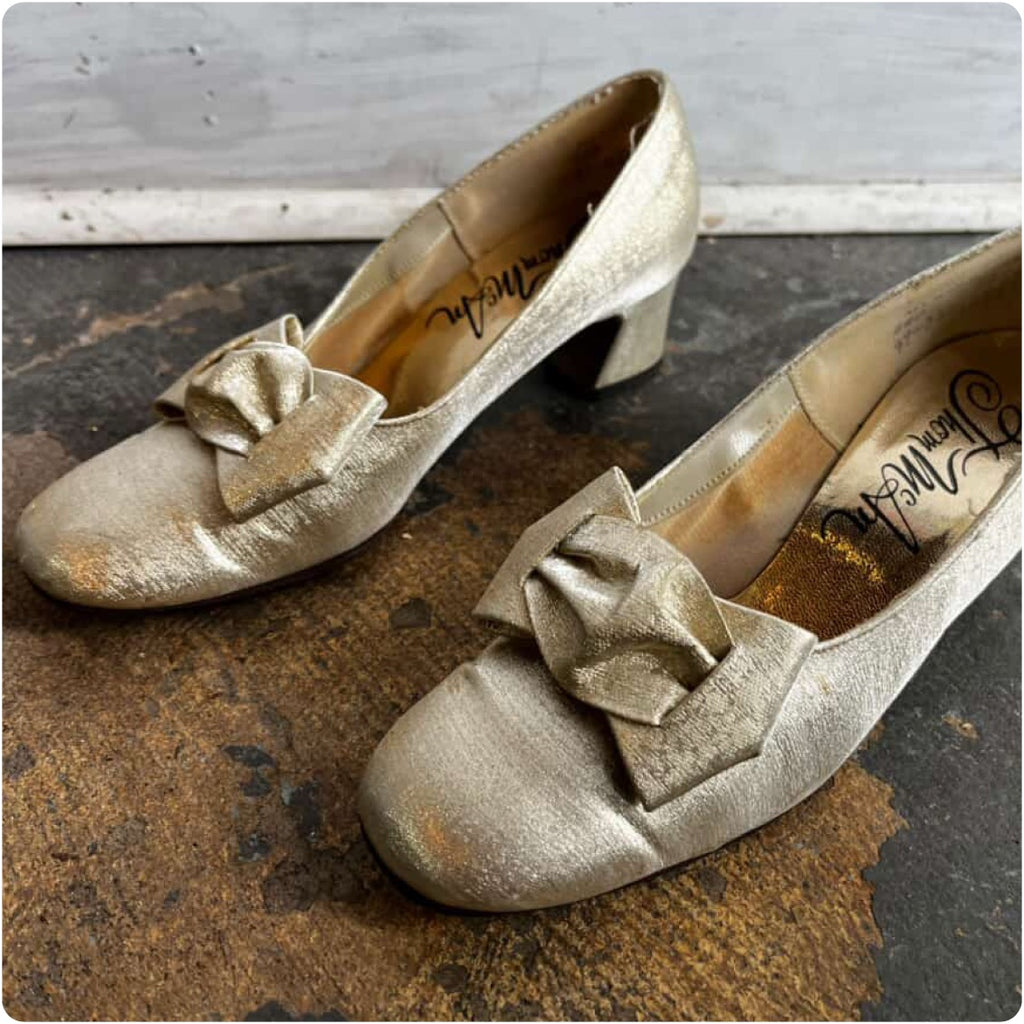 #1960sFashion #VintagePumps #MetallicHeels #MidCenturyStyle #RetroBows