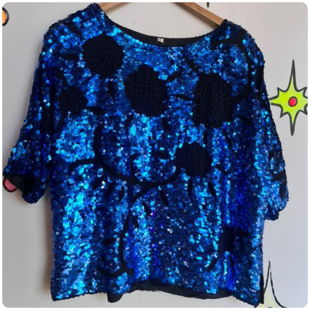 Vintage 70s 80s | Metallic Blue Sequin Disco Glam Dolman Sleeve Blouse Top | L