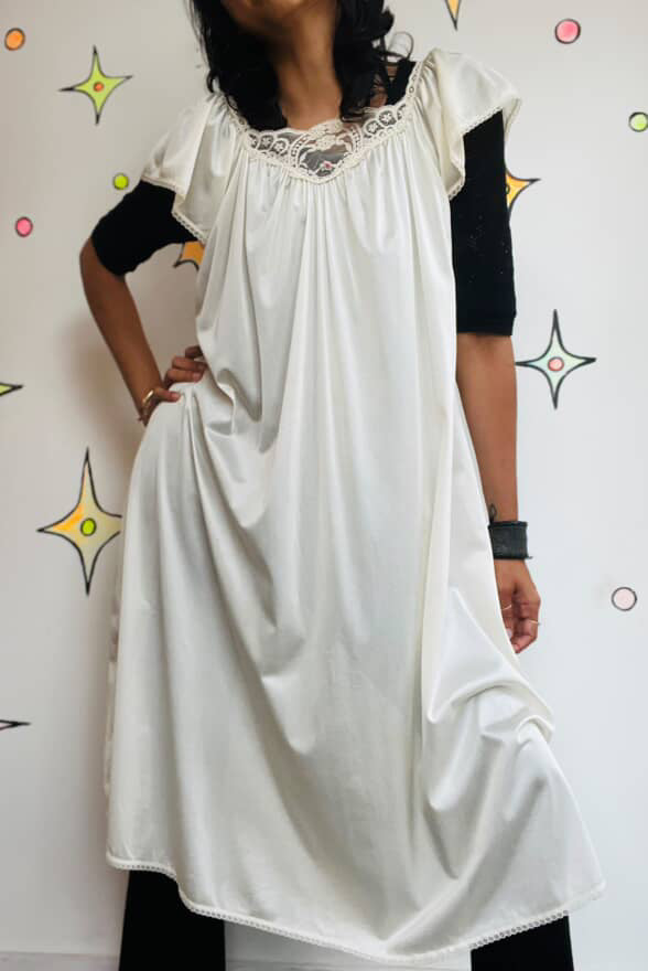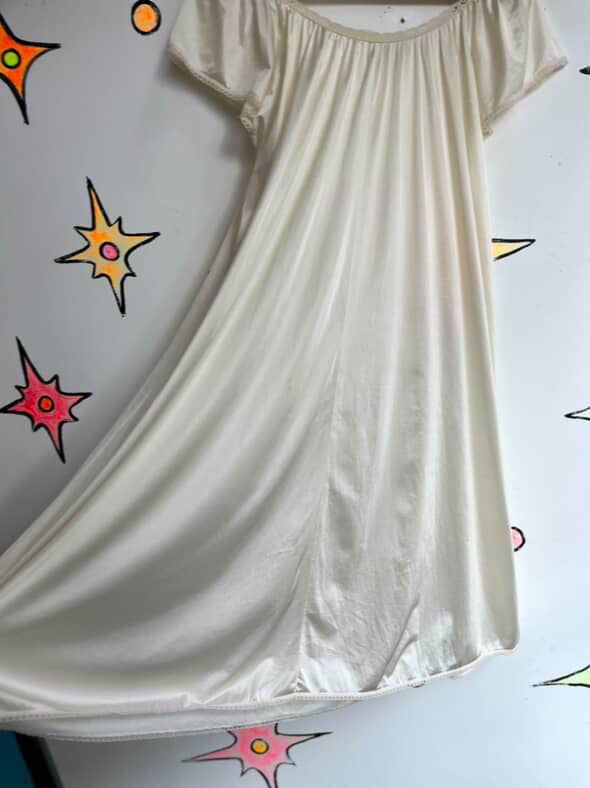 Delicate vintage 1970s-1980s off-white babydoll nighty gown featuring silky, flowy fabric with lace detailing. Perfect for grunge, fairy, or rococo-inspired aesthetics. Soft and lightweight, making it ideal for lounging, layering, or dreamy styling. A whimsical piece full of vintage charm.