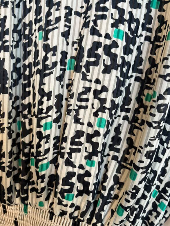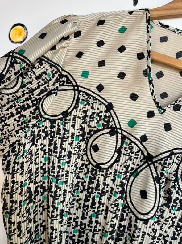 Turn heads with this Vintage 70s/80s Silky Disco Glam Boho Grunge Blouse! Featuring beige silky fabric with green triangle accents and bubble dolman sleeves, this wearable art piece exudes retro glam while staying boho-grunge chic. Perfect for layering, festival looks, or statement evening outfits. Loose, slouchy fit for effortless style.