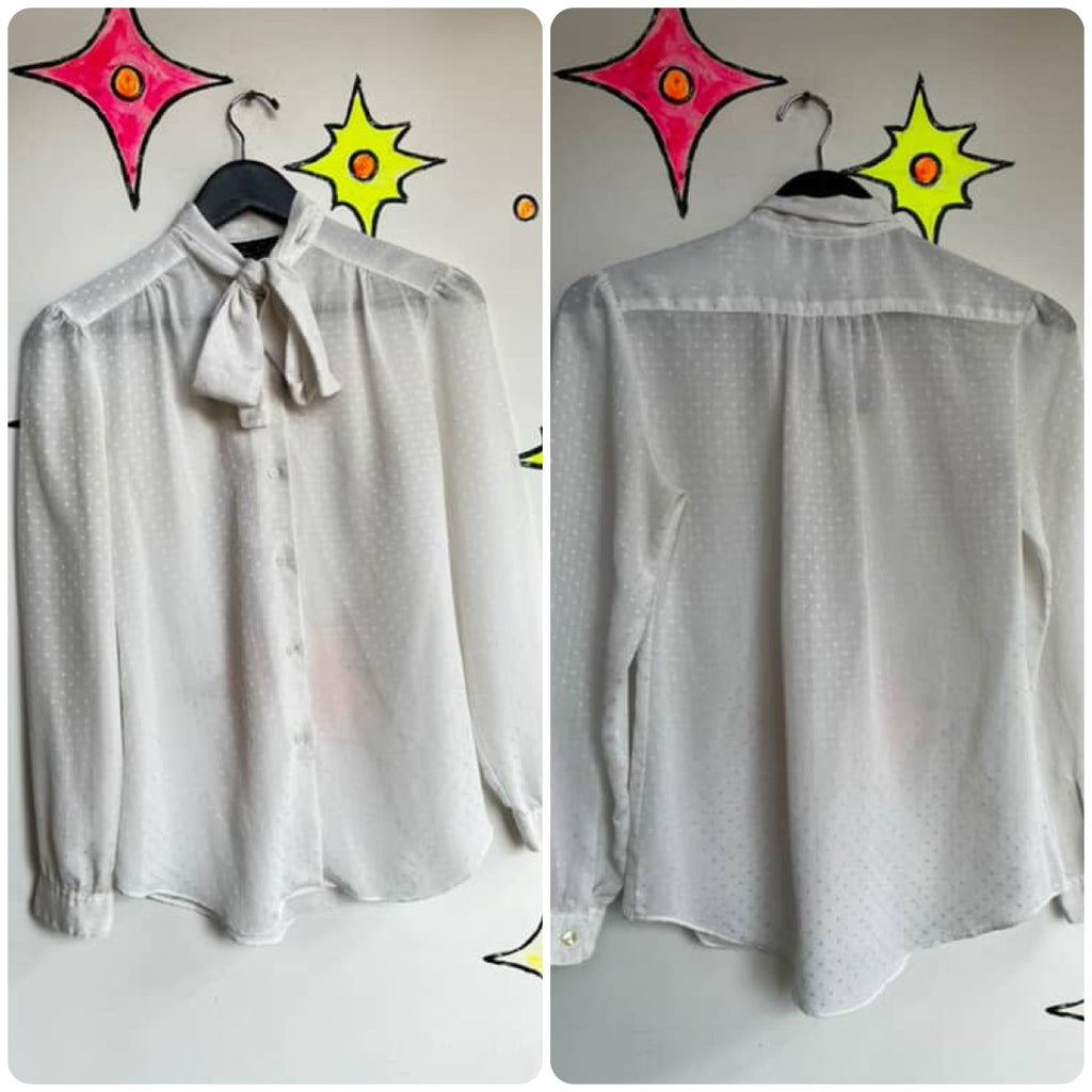 Classic, elegant, and effortlessly vintage - this creamy white secretary blouse from the 70s/80s features a romantic bow tie neckline that gives major retro romance energy. Lightweight polyester and soft tailoring make it perfect for tucking into high-waisted denim, layering under a vest, or styling with a midi skirt for that dreamy office-to-after-hours aesthetic.