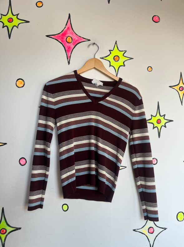 Cozy up in this vintage 1970s striped pullover sweater 🤎🌸 Featuring earthy brown tones with pastel stripes and a classic v-neck, this Bobbie Brooks knit blends retro charm with effortless grunge vibes.
