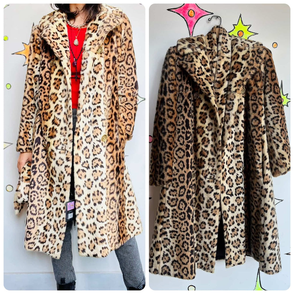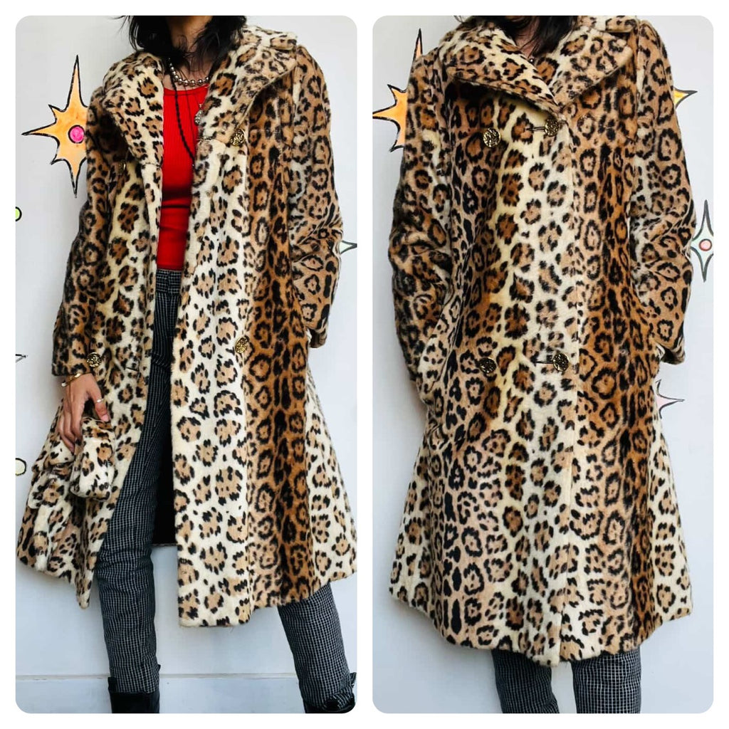 Serve pure retro vixen energy in this stunning vintage 70s leopard print faux fur coat. With a dramatic silhouette, cozy pockets, and a detached matching belt, it's the ultimate glam outerwear for wild hearts and cold nights. Soft, bold, and made to turn heads-this is a timeless piece for lovers of all things fierce and fabulous. No size tag, fits like a modern M (see measurements).