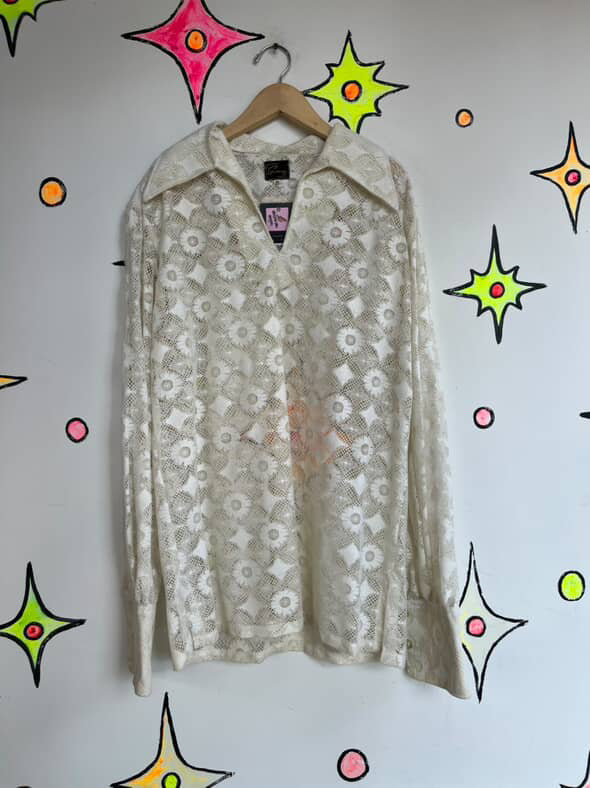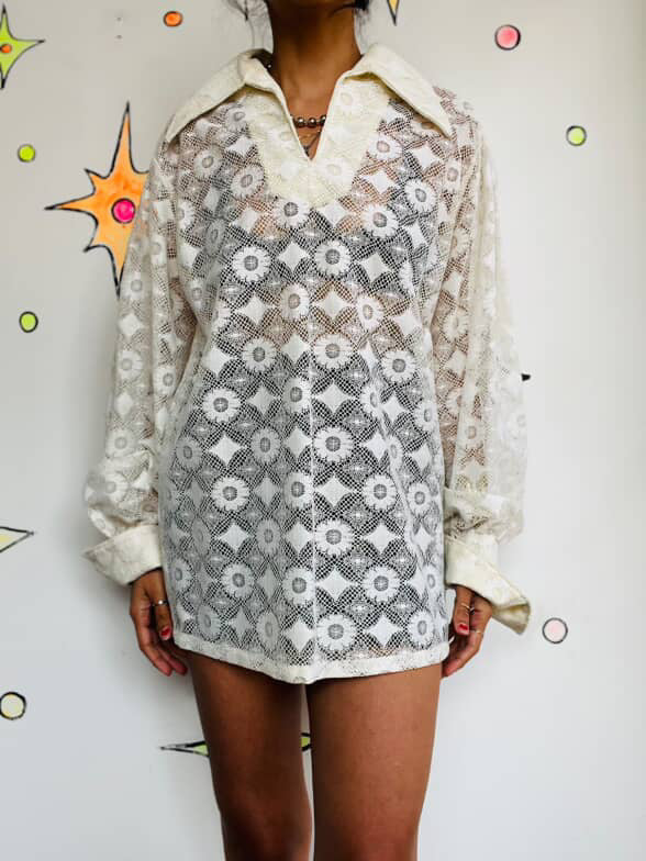 Dreamy and ethereal - this Vintage 70s White Sheer Lace Blouse is the perfect mix of romantic boho and grunge edge. Featuring a dagger collar, lace detailing, and semi-sheer cream fabric, this piece embodies effortless vintage cool. Style it tucked into denim, layered over a slip, or paired with wide-leg trousers for that 70s-meets-Y2K revival.