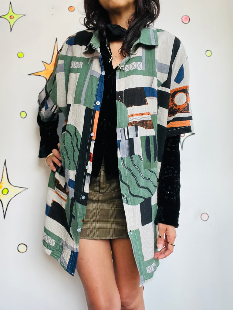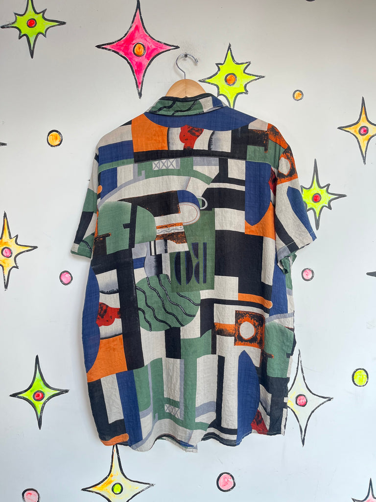 Step into the bold creativity of the late 80s and early 90s with this vintage abstract wearable art shirt. Designed in an oversized unisex fit, this short sleeve button-up features a vivid abstract print perfect for statement looks, parties, or casual art-inspired styling. Crafted from 100% breathable cotton, it's soft, lightweight, and ideal for layering or wearing as a shirt dress or tunic.