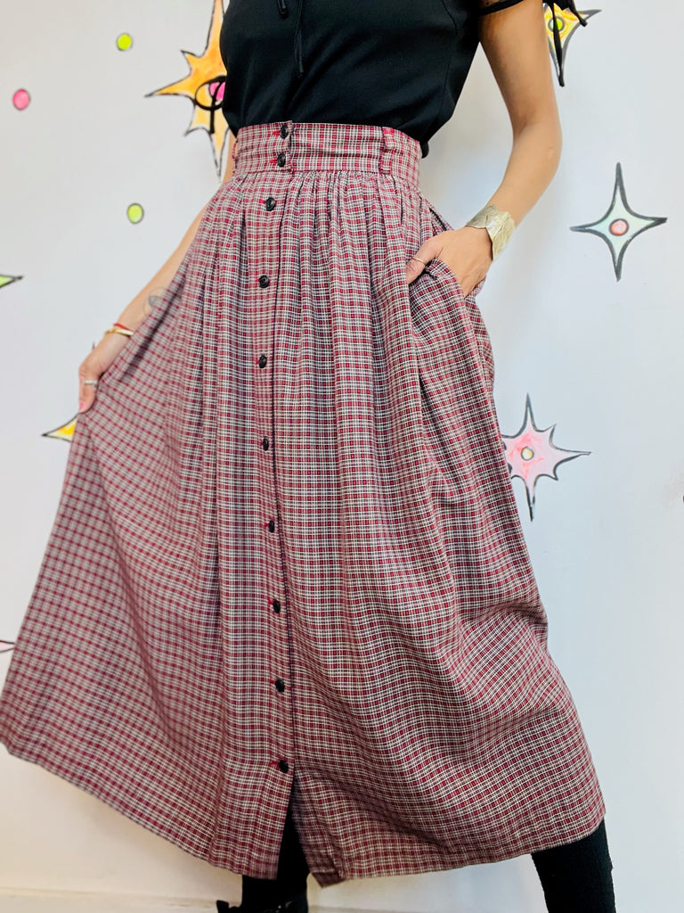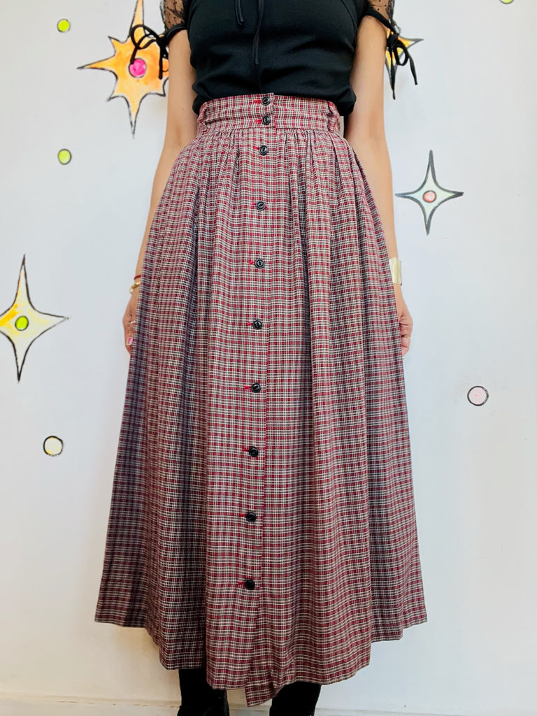 Step into timeless 1980s Banana Republic style with this beautifully soft plaid midi skirt. Featuring a classic A-line silhouette and cozy boho-grunge vibes, this piece blends comfort and sophistication. Perfect for fall layering, dark academia styling, or everyday vintage wear.