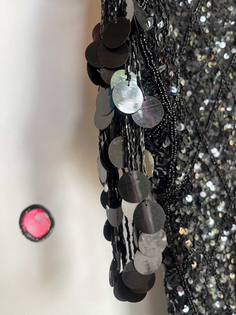 Channel vintage glamour with this stunning 1980s Neiman Marcus party dress. Inspired by the glitz of the 1920s flapper era, it features rows of shimmering black beadwork and flirty fringe that moves with every step. Equal parts disco diva and cowgirl glam - perfect for parties, festivals, or a bold night out.