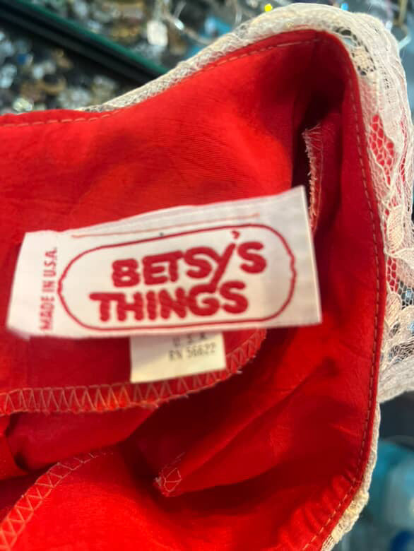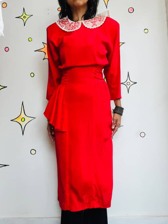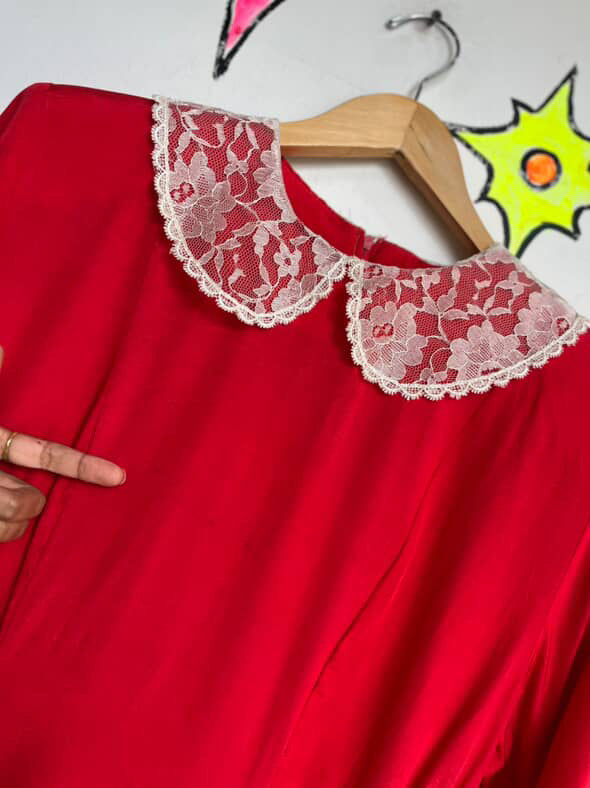 Step into retro romance with this never-worn 1980s Betsy's Things secretary dress. The bold cherry red hue, sweet babydoll silhouette, and dainty white lace collar give it a glam-meets-grunge edge perfect for statement vintage styling.