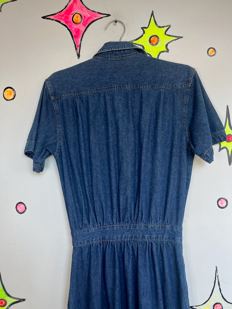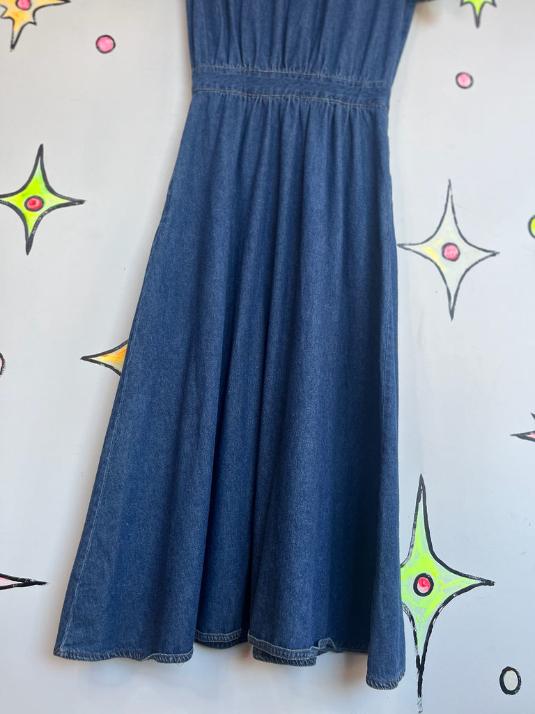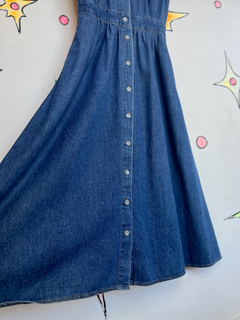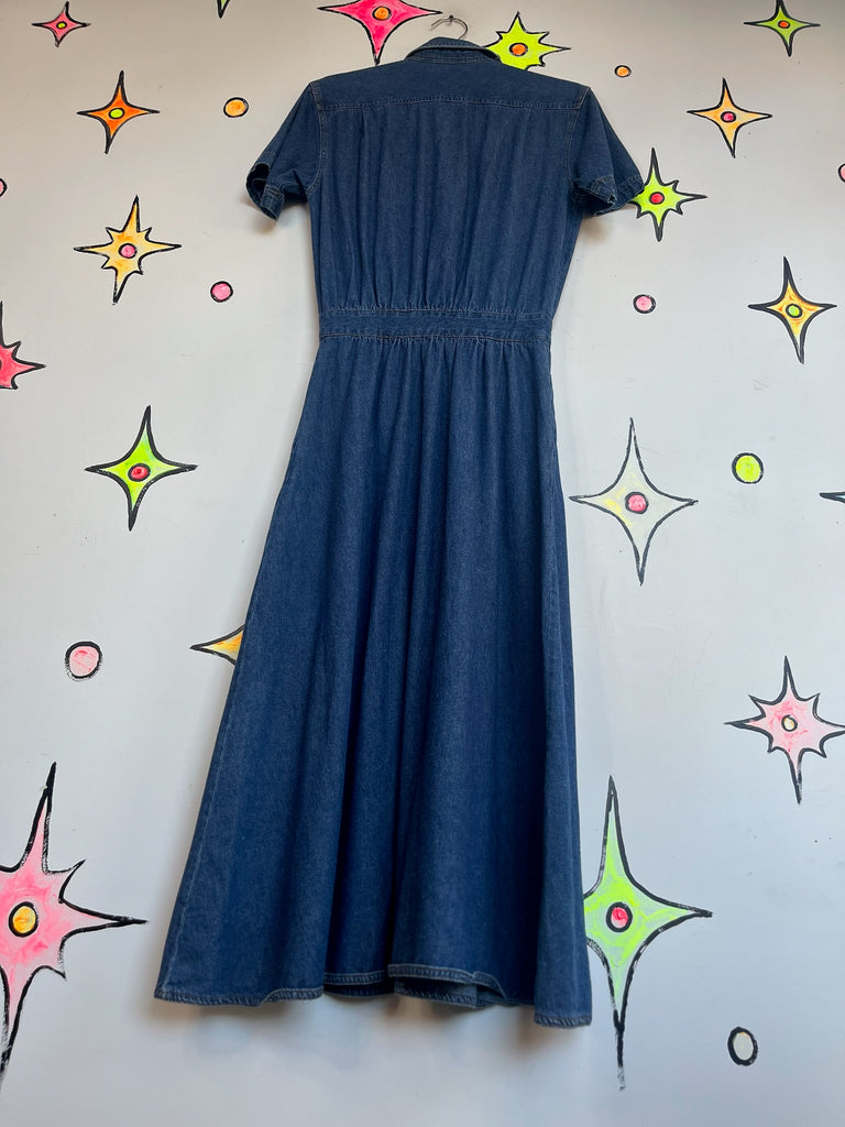 Step into laid-back 90s cool girl energy with this vintage denim button-down midi dress. The perfect blend of grunge, boho, and streetstyle, it features a flattering A-line silhouette, full-length button front, and handy side pockets. Effortlessly chic layered over a baby tee or under a chunky cardigan - this piece is a timeless wardrobe essential for denim lovers and vintage collectors alike.