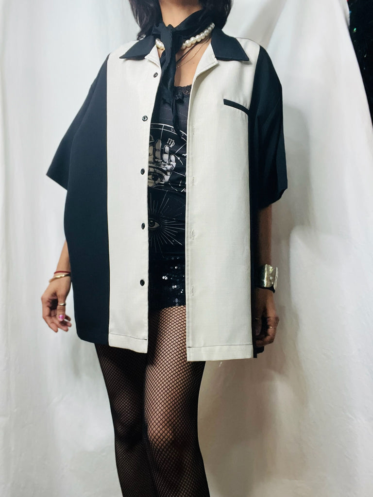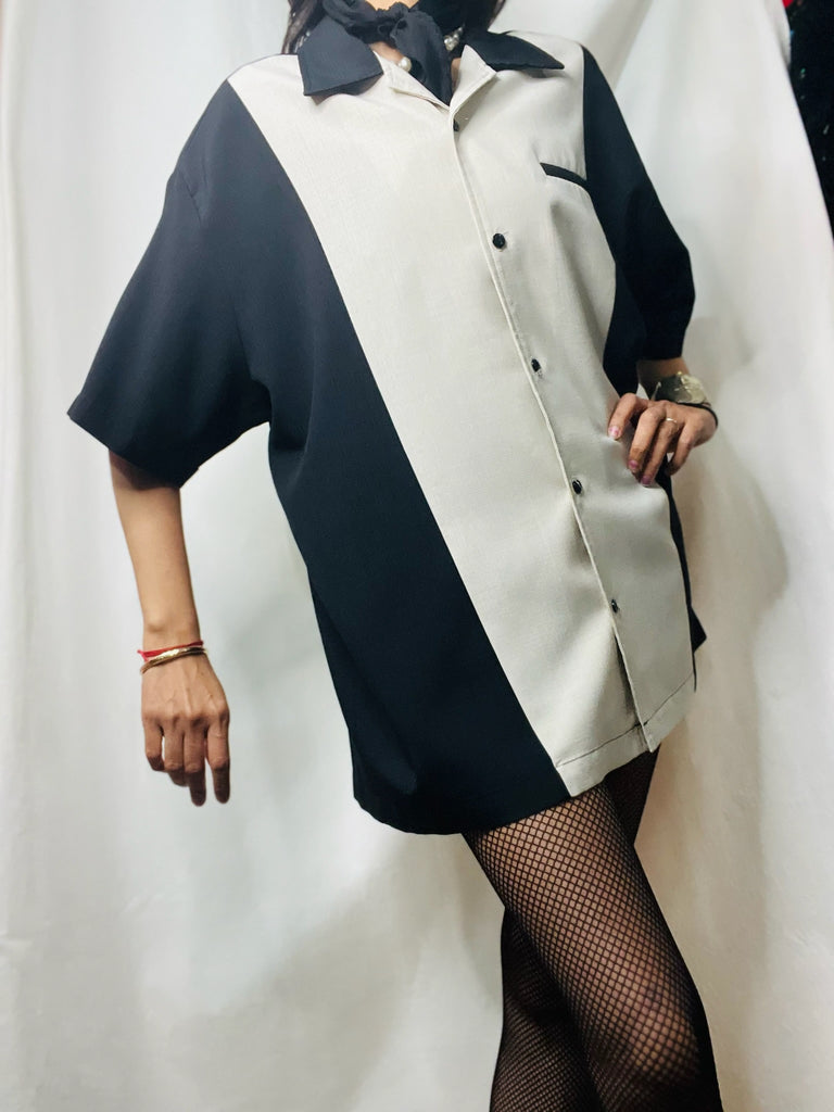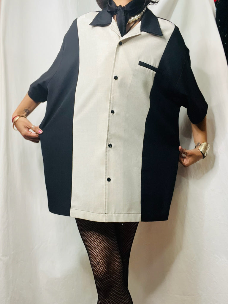 Channel that cool mid-century energy with this 90s does 50s retro rockabilly shirt by Daddy O's. Featuring a beige and black colorblock design with a short sleeve cut and button front, this piece brings the perfect mix of vintage attitude and modern comfort.