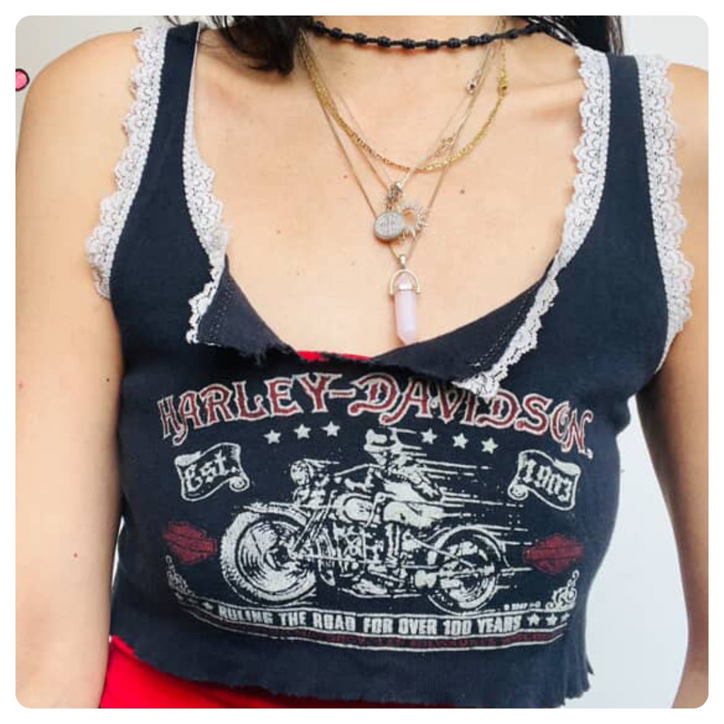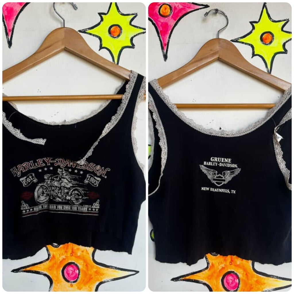 Vintage 90s ' Harley Davidson Lace Trim Cut Off Cropped Tank Cami Tee T Shirt