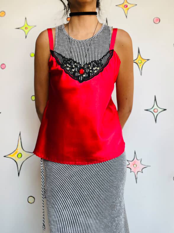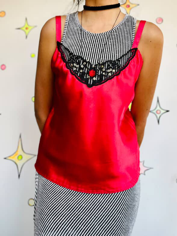Vintage 90s Vampire Red & Black Lace Silky Cami Top ' Embellished Lingerie ' Fairy Goth Grunge ' M