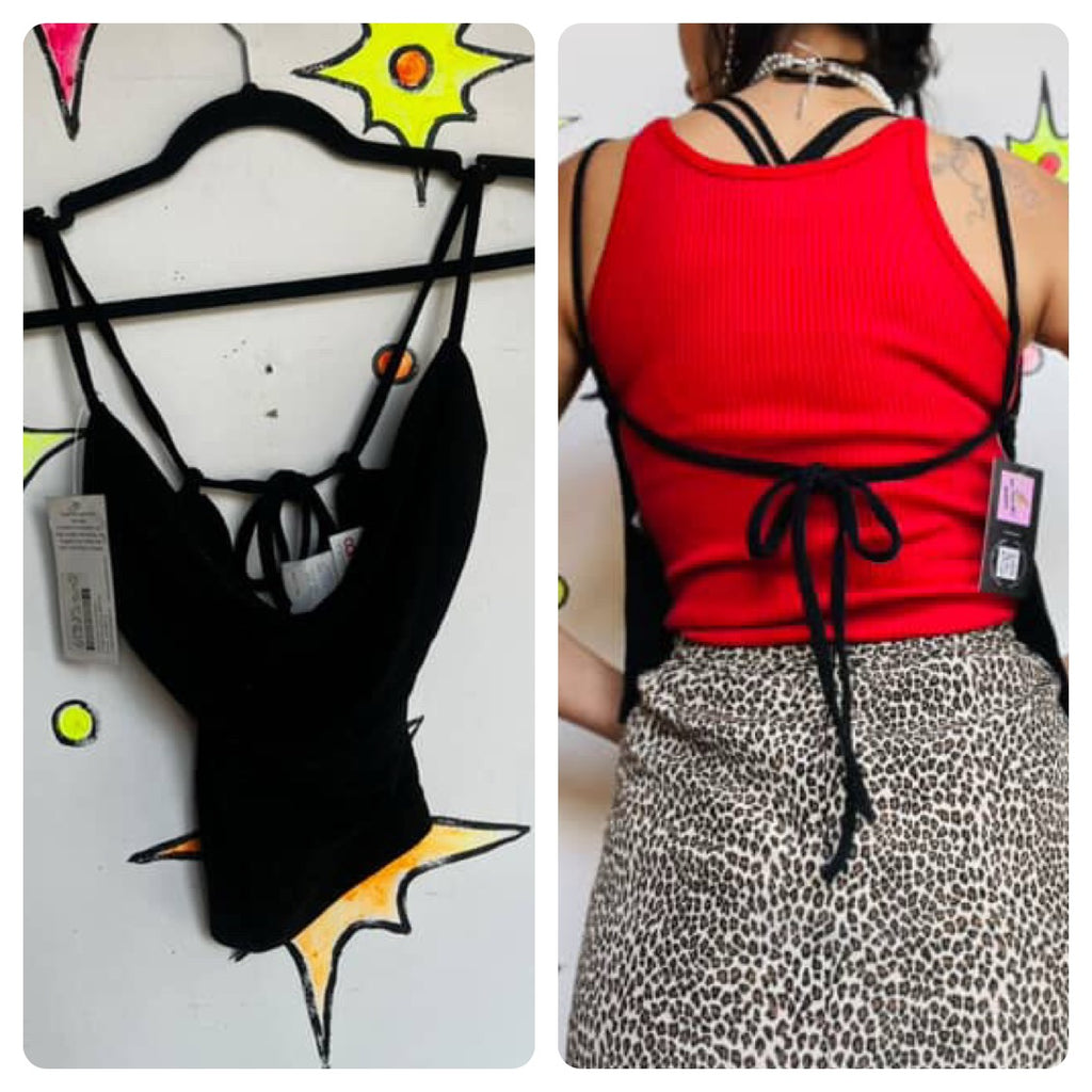 A total Y2K dream-this vintage deadstock black cami top is slinky, sparkly, and backless for that perfect mix of edgy and glam. Features subtle glitter throughout, a curve-skimming fit, and a barely-there vibe made for dance floors, rooftops, or late-night mischief. Never worn, with original tags attached.