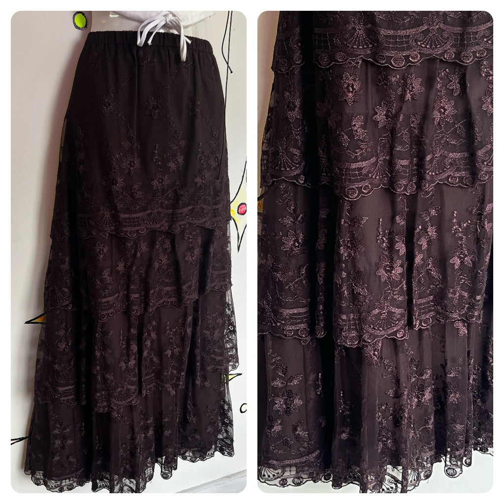 Vintage 90s Y2K | Black Fairy Grunge Whimsy Goth Tiered Ruffle Maxi Skirt | XL
