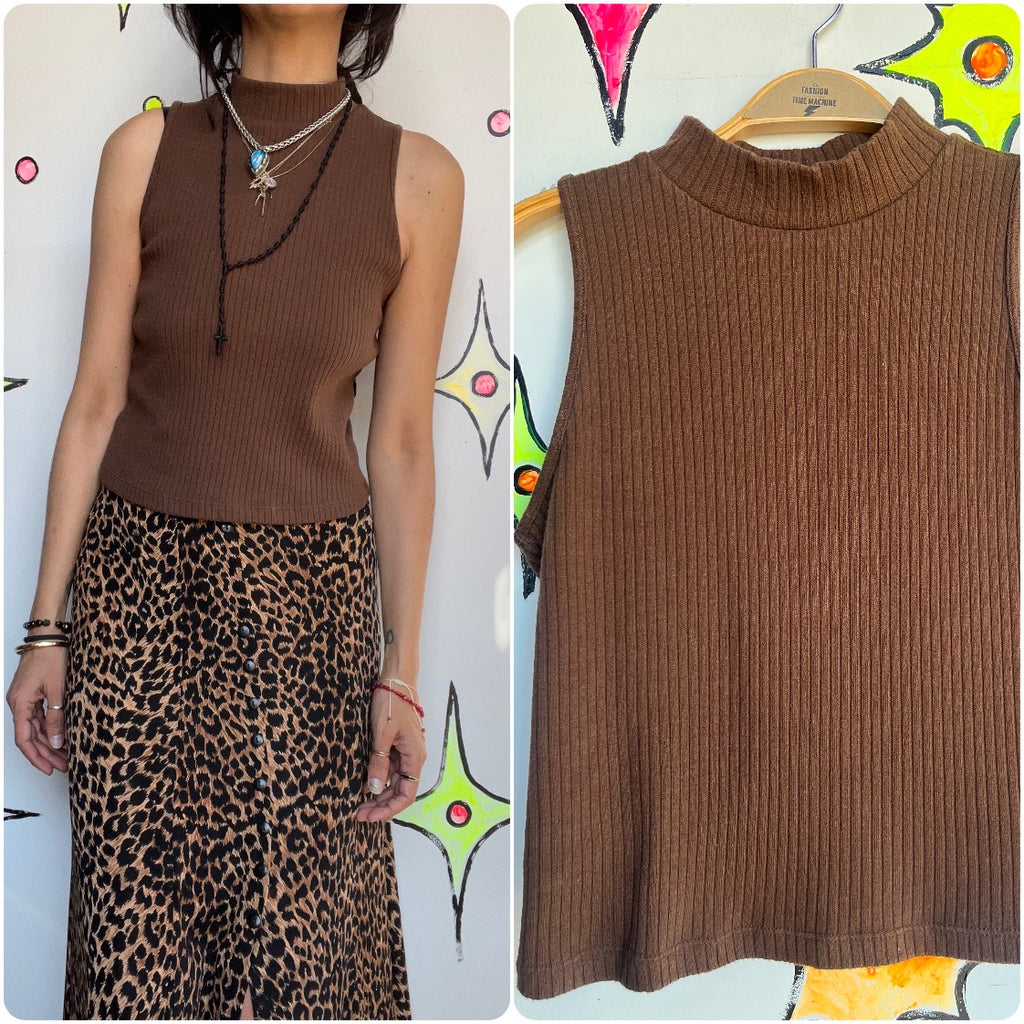 Vintage 90s Y2K Fairy Grunge Boho Emo Brown Turtleneck Ribbed SleevelessTop S