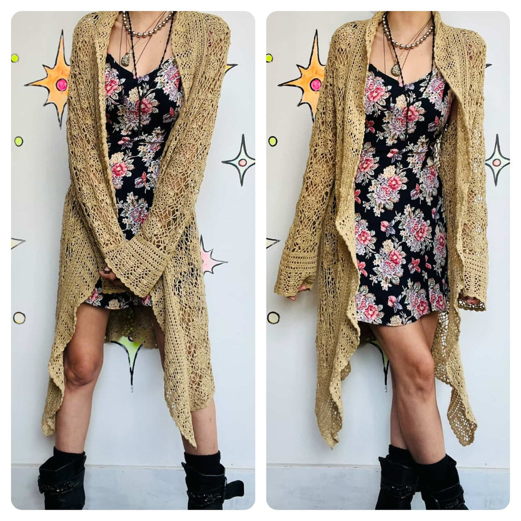 Vintage 90s Y2K Gold Crochet Fairy Grunge Boho Duster Robe Sweater – 14/16