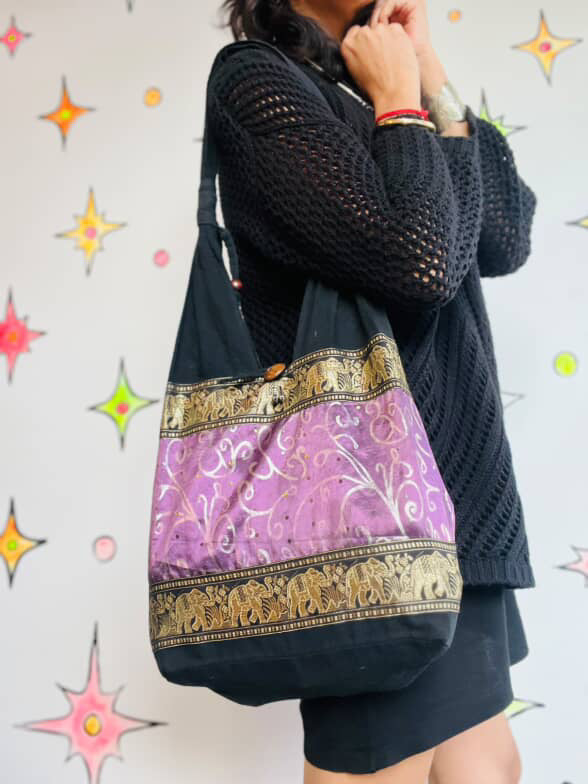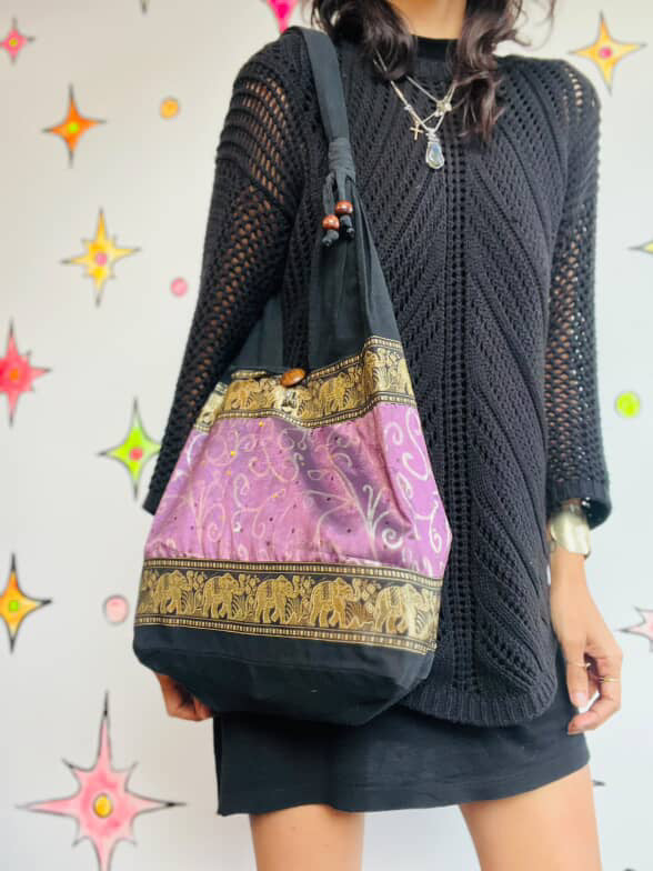 A magical mix of boho and grunge, this vintage black canvas tote features golden elephant prints with rich purple accents. Perfectly slouchy and artsy, it's ideal for festivals, markets, or everyday use. Lightweight yet roomy enough for essentials - a unique statement piece for free-spirited styles.