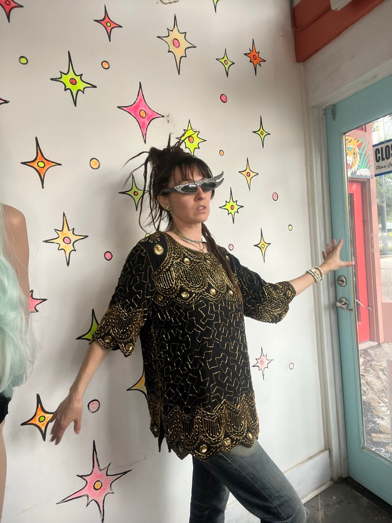Description: Get ready for the spotlight in this 100% silk beaded top. Featuring an intricate black and gold pattern with heavy sequin and beadwork, this piece is pure disco glam. A luxurious and heavy-weight statement top that screams 80s opulence.