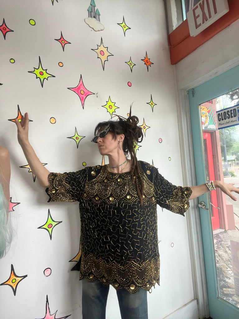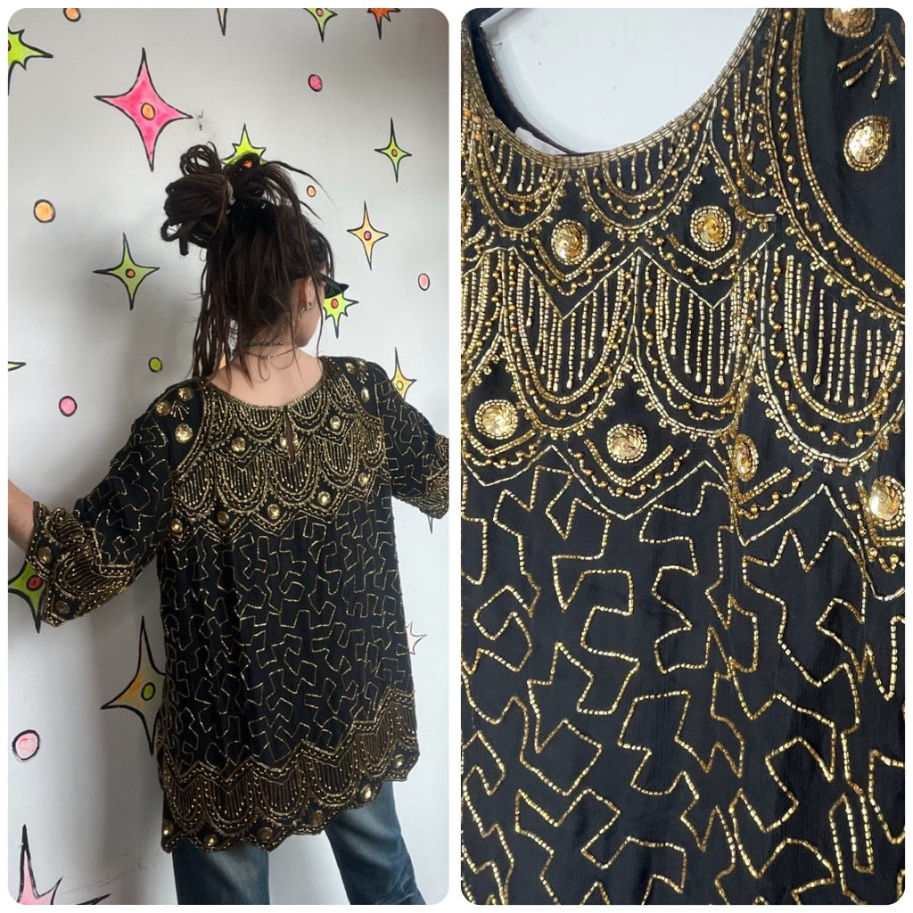 Vintage Black and Gold 80s Silk Beaded Top Glam Party Disco Sequins L/XL